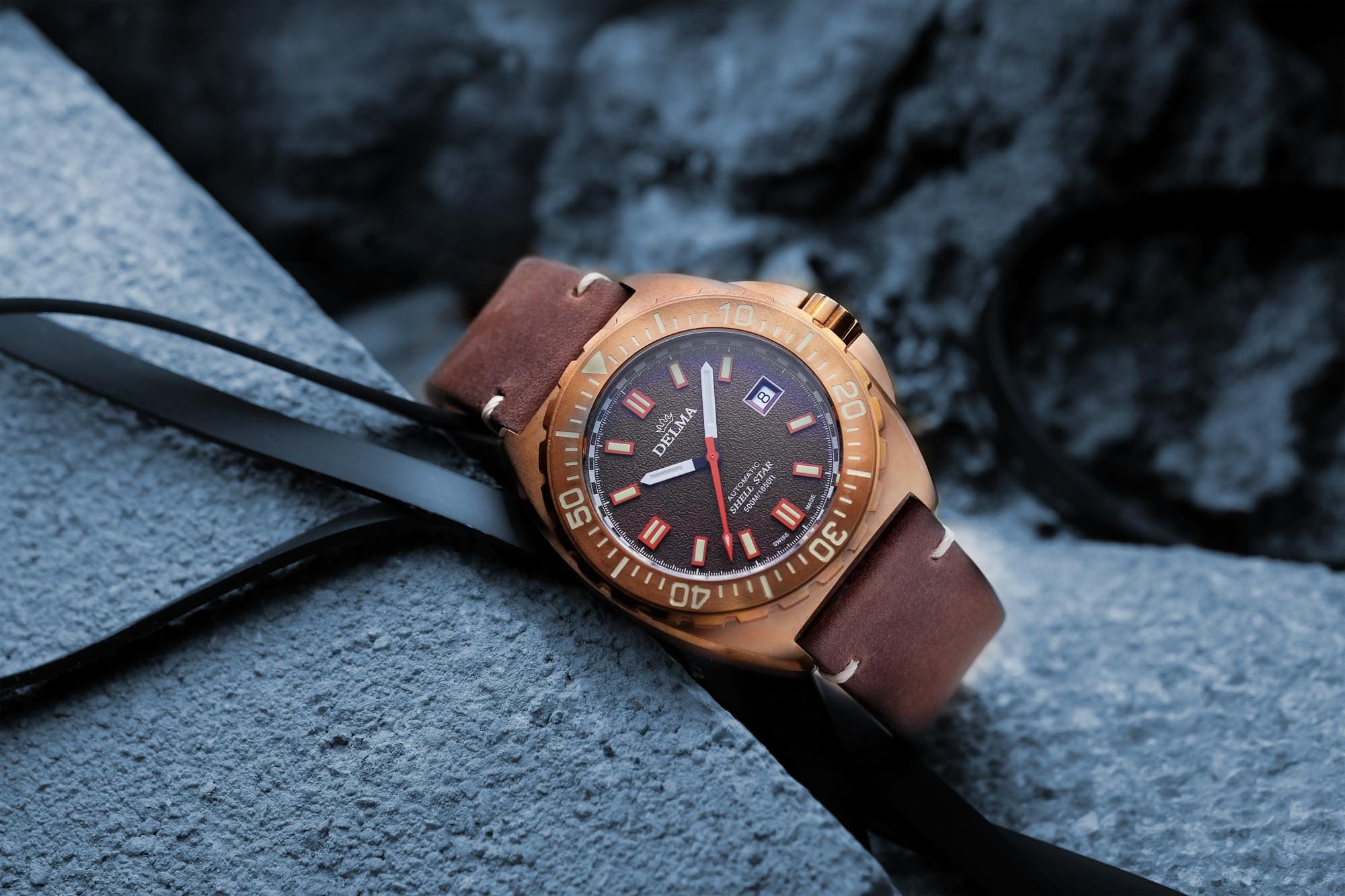Meanwhile, Swiss brand Delma announced a bronze version of its Shell Star Diver to celebrate the 50th anniversary of its dive watches. The 44mm, 500 meter water resistant, bronze divers use an ETA 2824-2 which is visible through a display back. Available with either a brown, green or blue dial and 5 unique leather strap choices, there will be 500 made in total. The bezel is also in bronze and I think the overall look is cool, especially with the checkered chapter ring. The watches retail for 1,490 Euros and are available on the official Delma site now.