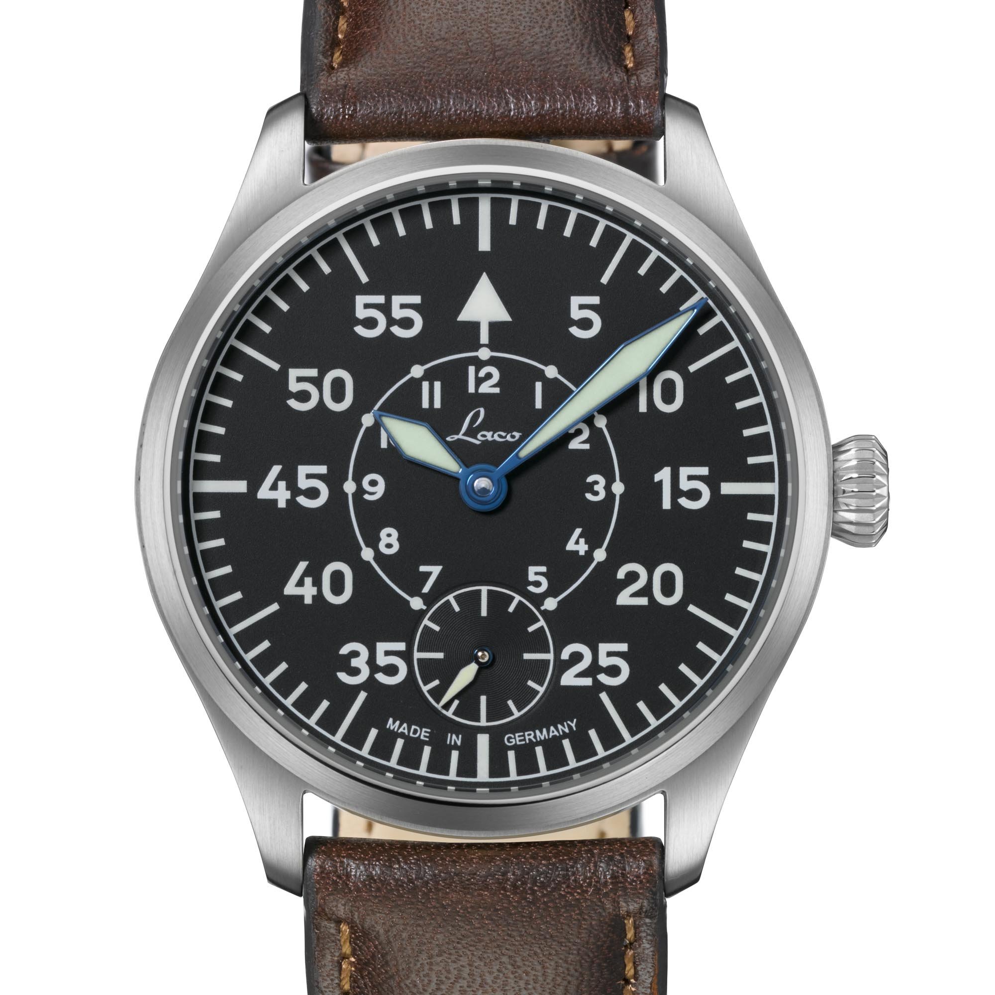 I really enjoy the look of Laco’s watches and today’s new pieces are no exception. Laco sent us information on their new Ulm & Würzburg pieces, which are slightly dressier versions of their historic pilot’s “A” and “B” models. The Ulm is based on the “A” and the Würzburg on the “B”. I say dressy as they use a more modern, yet still simple, brushed stainless case. At 42.5mm in diameter (49.8mm lug to lug) and just 11mm high, the watches contain the handwound Laco 98 caliber (ETA 6498.1).