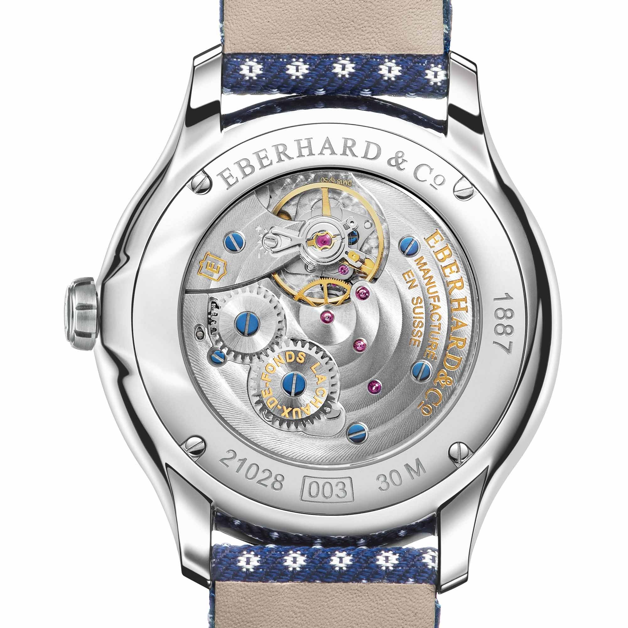The 9.6mm thick case also features a display back where the movement can be seen. The watches will be priced at 3,640 CHF on silk and 3,720 CHF on alligator. Head to the official Eberhard site – although info does not seem to be available quite yet.