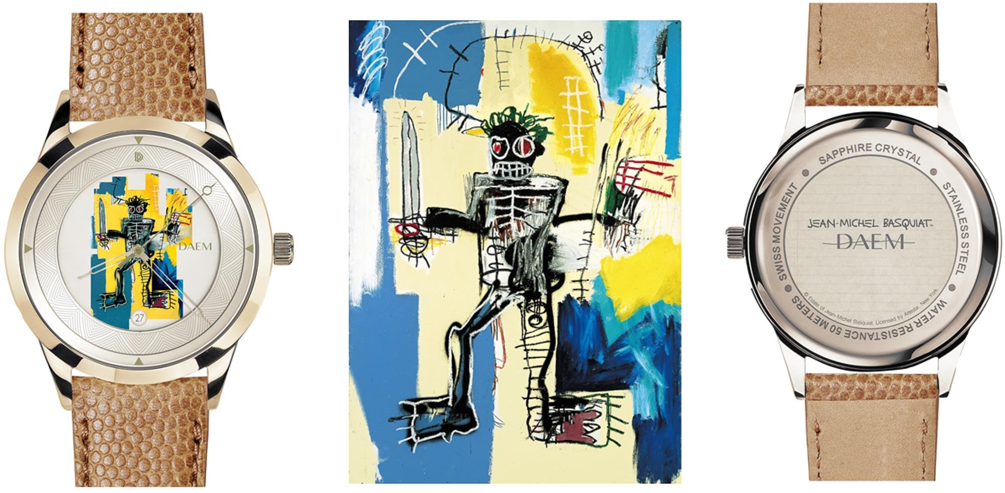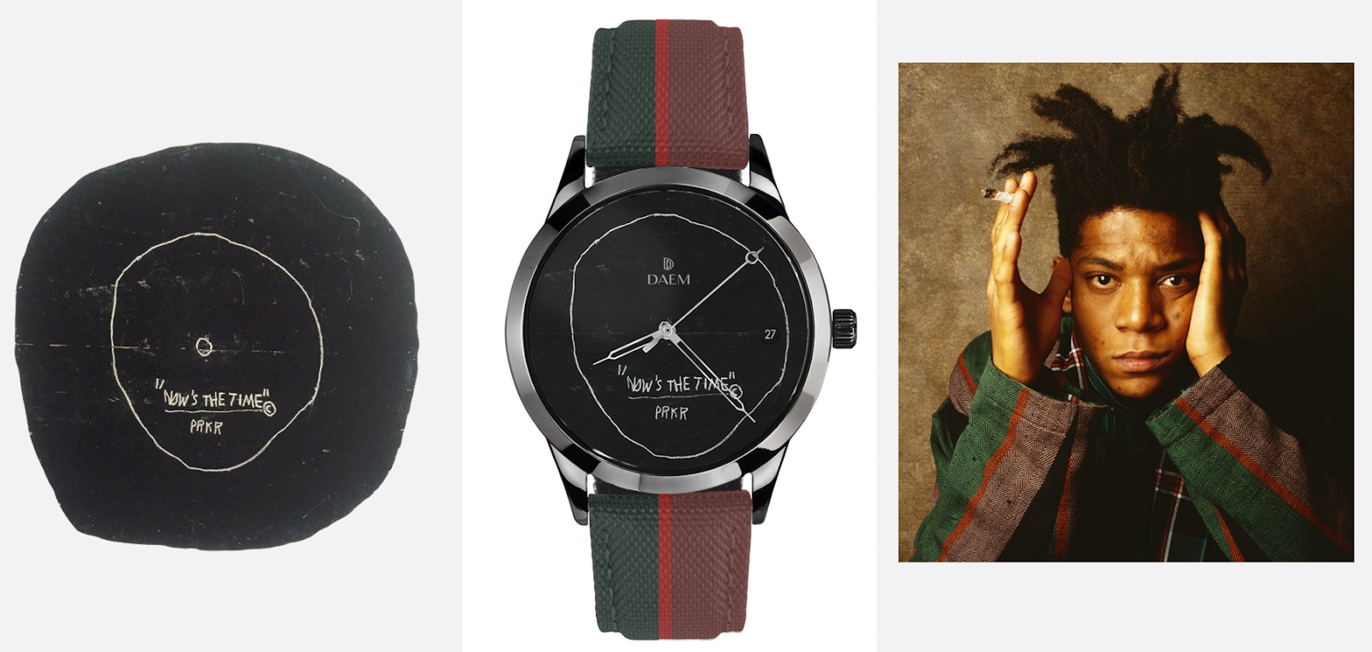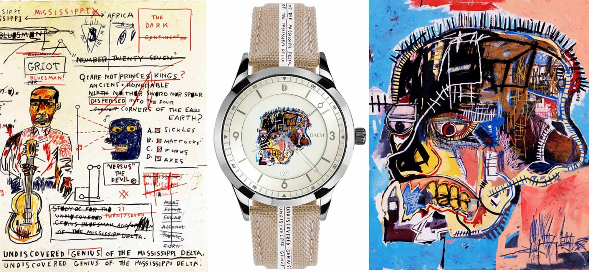 Brooklyn-based DAEM Watches sent us news of three new pieces that tie into the works of iconic artist Jean-Michel Basquiat. The watches will release on December 4th and each feature an work by Basquiat on the dial along with a strap designed to fit the theme of the piece.