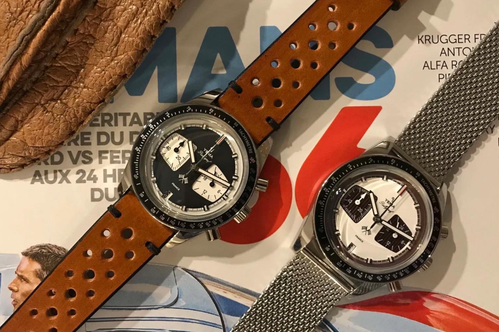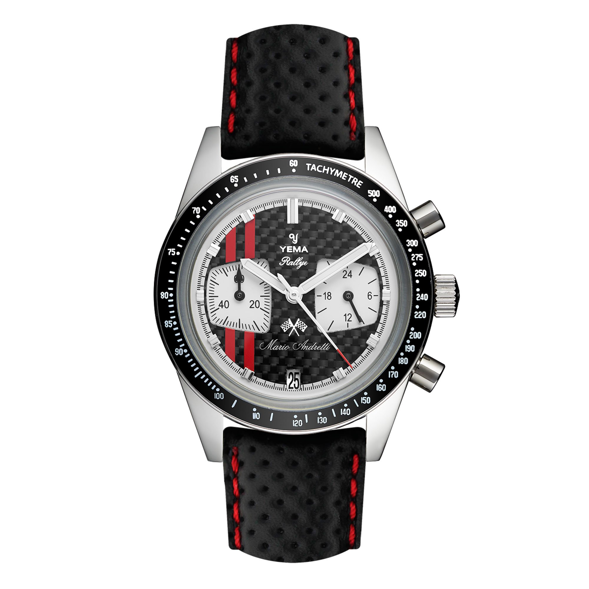 Yema sent us news of a new Rallygraf collection using the Seiko VK64 Meca-Quartz. These 39mm stainless pieces feature a mineral crystal, 2 registers and date. There are 5 different “panda” dial options including a red-striped Mario Andretti version. The non-Mario editions run 329 Euros on strap and 349 on a mesh bracelet.