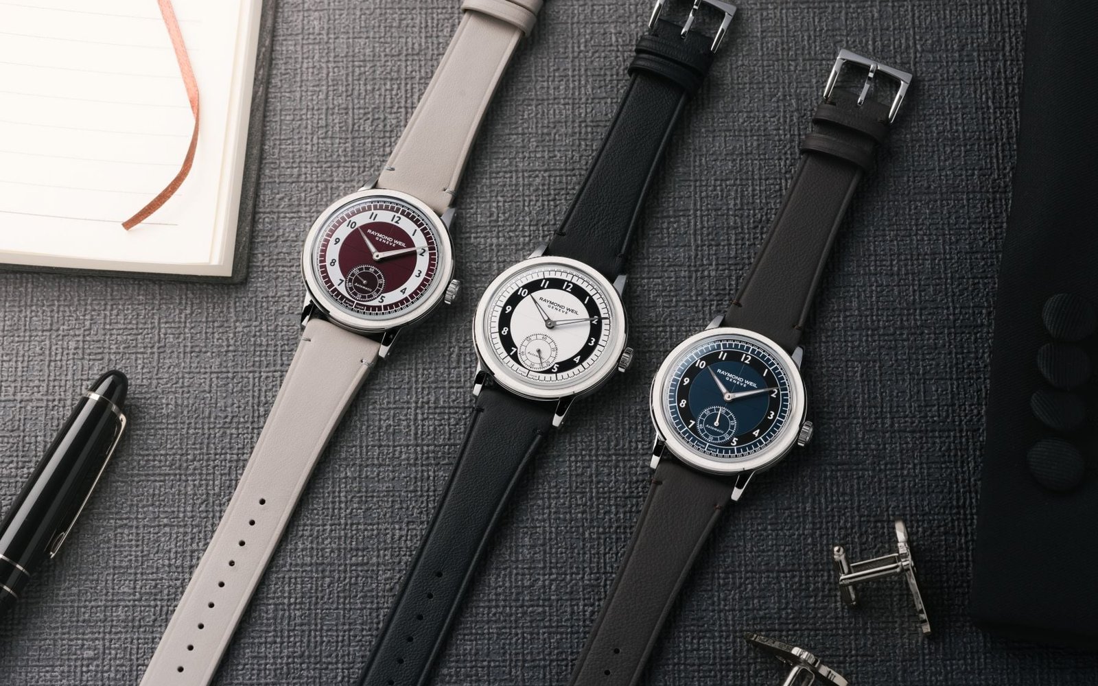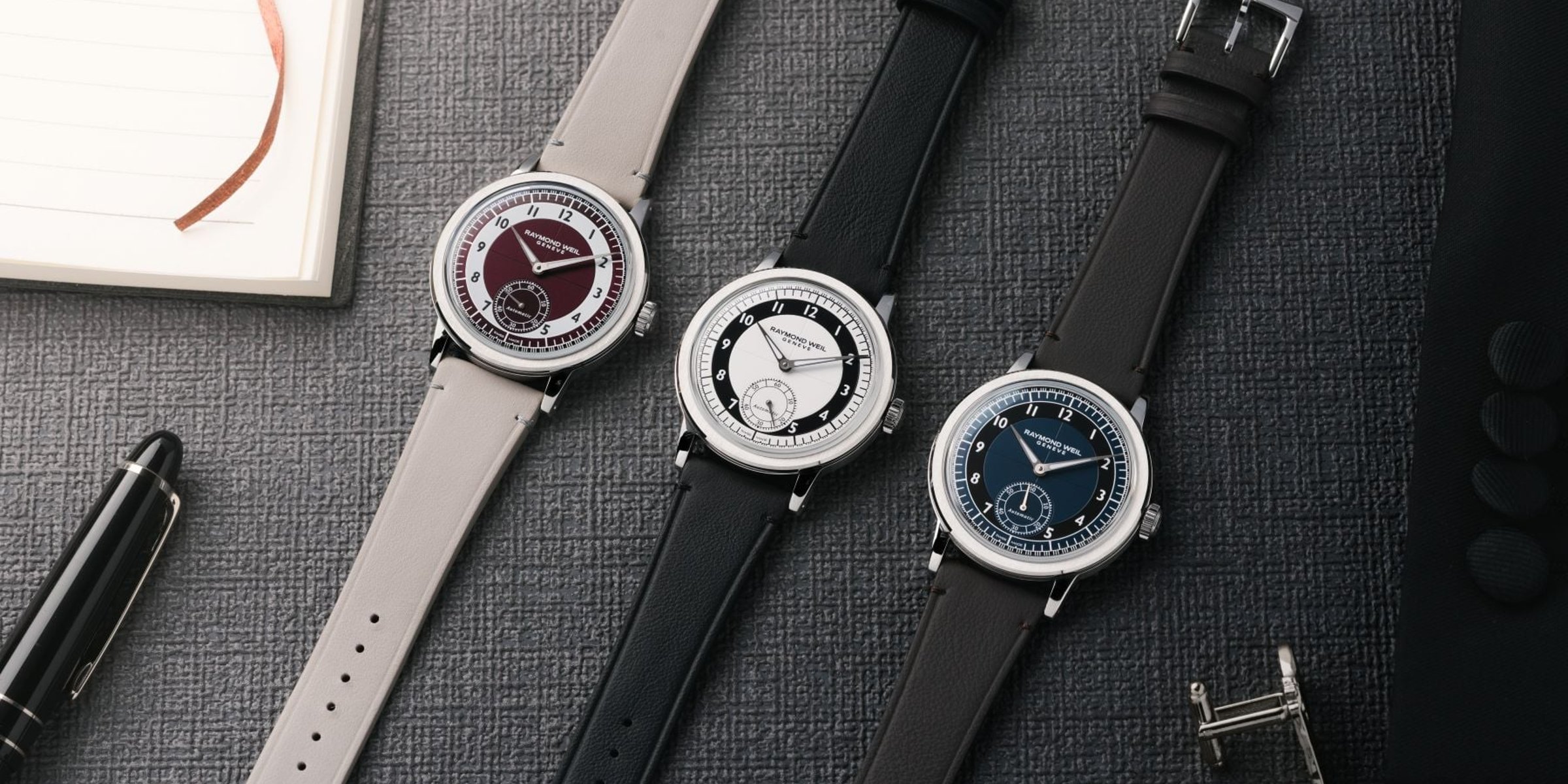 Three New Raymond Weil Millesime Small Seconds watches with tuxedo dials