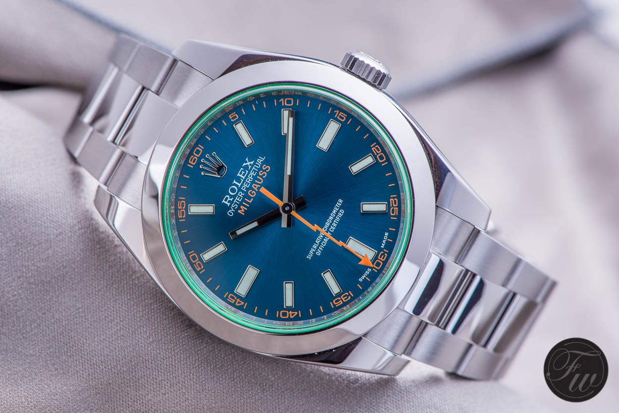 The current Milgauss (ref. 116400GV) is only available with a green sapphire crystal and you have the choice of two different dials. A ‘standard’ black dial as introduced with the Anniversary Model in 2007 or the Z-Blue dial Rolex introduced in 2014. This blue dial is even more shocking than the black one because it creates a color combination that you can define as quirky and unusual for Rolex standards. Rolex is known to be conservative in updating designs by taking small steps, but the Milgauss is all but conservative. Today there are large groups of Milgauss lovers because it’s one of the few Rolex watches in the collection that is both modern and colorful.