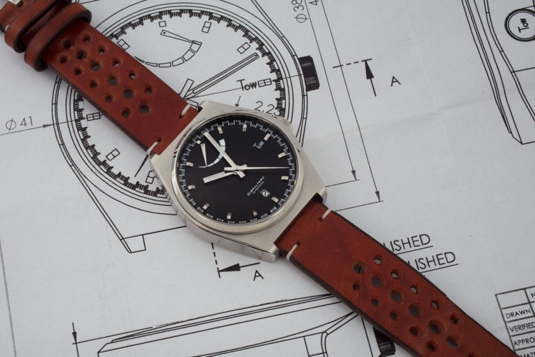 The Gibralfaro is offered with two different strap options. A full leather nato and a racing style strap, inspired in the micro-perforated leather of the seats and steering wheels of classic sport cars. Both handmade in vegetable tanned leathers locally in Spain.