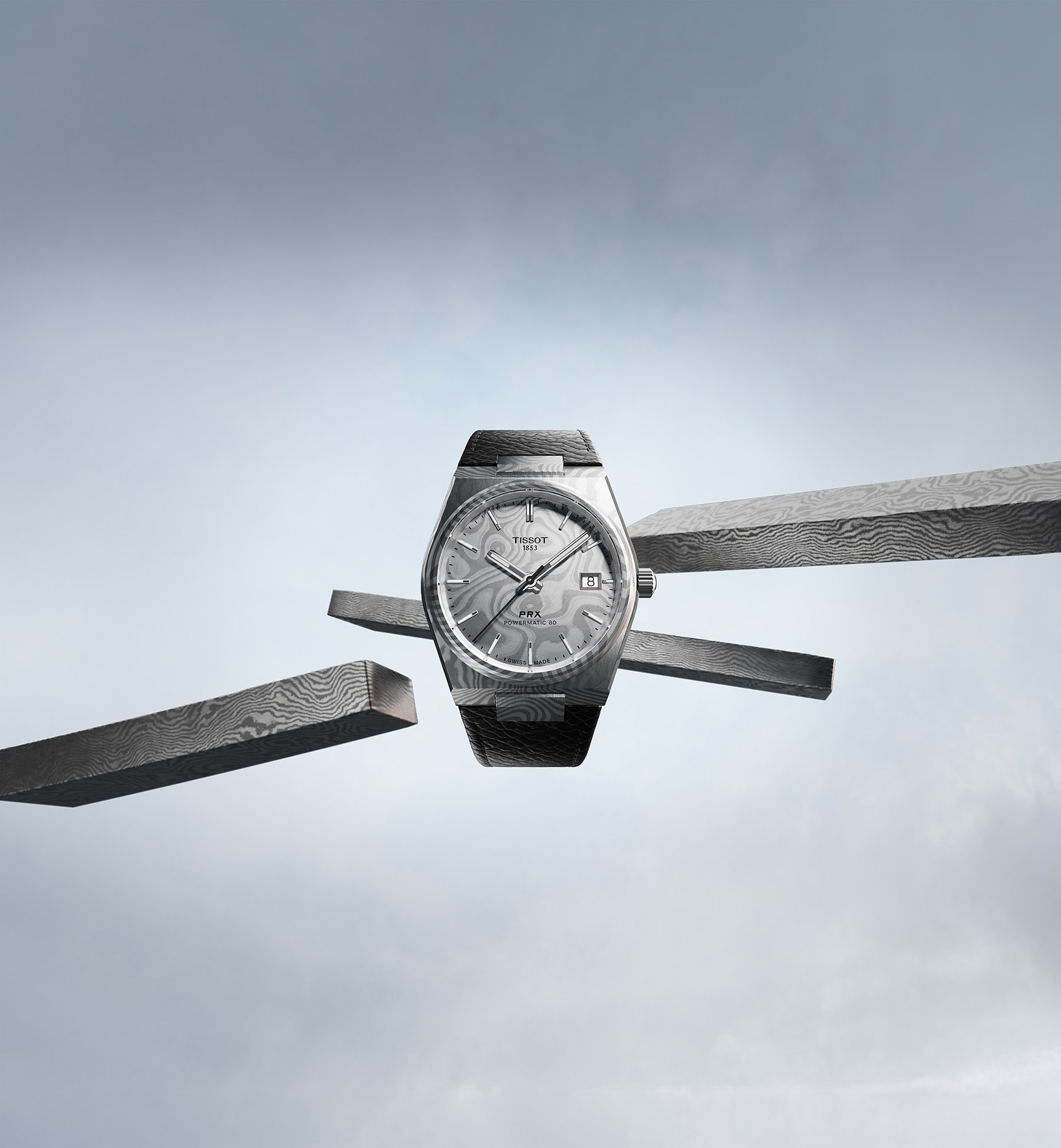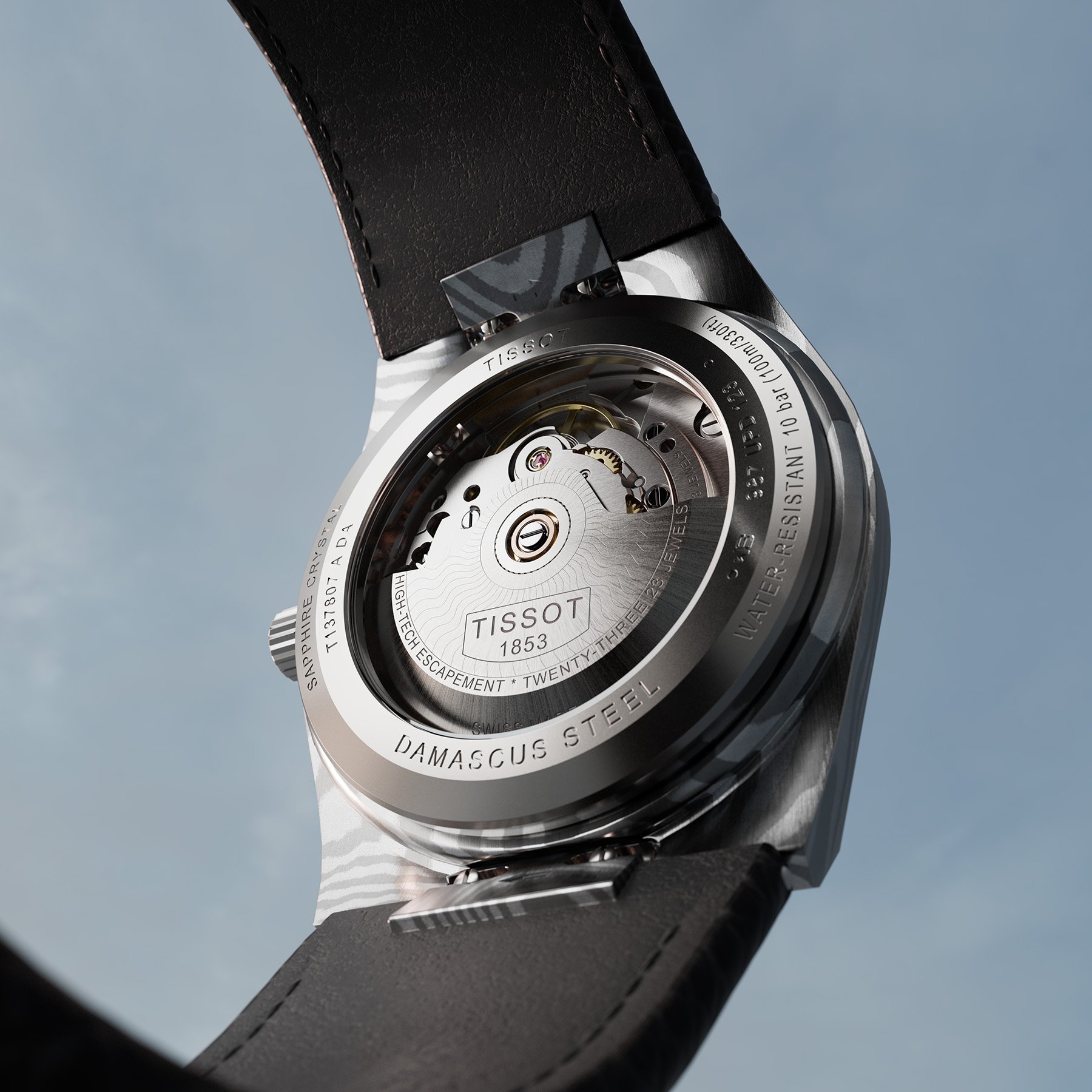 But that is not where it ends. Tissot is introducing another new version of its successful PRX, this time in Damascus steel. This case has the same 38mm diameter and 10.98mm profile as the titanium variants. The particularly cool thing is that it matches a Damascus steel dial, which truly emphasizes the metal’s distinct look. Its patterned presence is unlike any other material used in watchmaking. By creating both the case and the dial from this metal, Tissot has given the PRX a unique, impactful appearance.