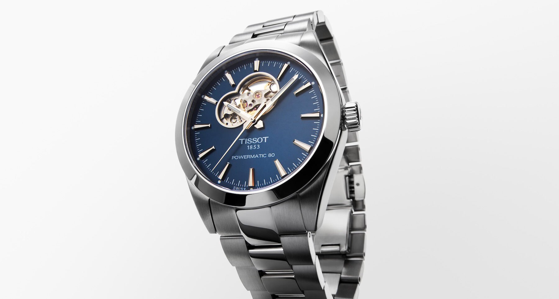 The Gentleman Open Heart is naturally fitting for a day out of the ordinary. This 40mm steel watch has an unusual opening on the blue dial to partially reveal the movement beneath. Its transparent case back puts the Powermatic 80.601 caliber on full display to afford you a better view. This self-winding mechanism features a patented Nivachron balance spring and offers 80 hours of power reserve. The time-only Tissot Gentleman Open Heart retails for €875 including VAT.
