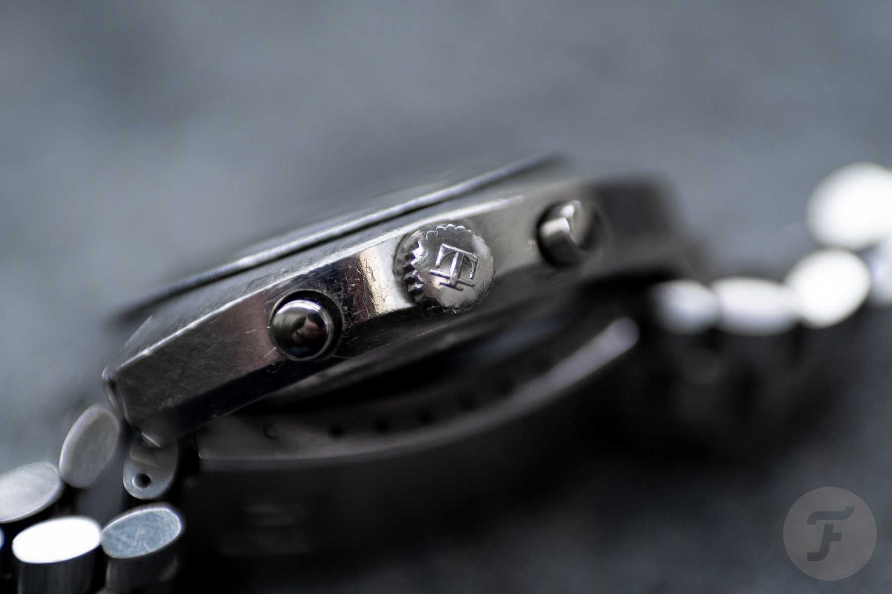 There is something so crisp and light about the color combination on the sunburst silver dial. The reflective outer track on the registers and radial grained inner portion certainly beat the flatter dials on the black or panda models. Those dials also don’t feature the applied frame around the 6 o’clock date window — a feature that seems almost out of place in a watch from the 70’s. There is also something so perfect about the dial layout. It’s perfectly balanced, extremely legible, and timeless. The applied markers are filled with tritium, as shown by the “T Swiss Made T” text that straddles the date window. The outer minute track is mirrored by the black tachymeter scale, separated only by a slim polished rehaut. A domed acrylic crystal and wonderfully jangly bracelet are the whipped cream and cherry on top. Bracelet or rally strap, either way, I’ll take it!