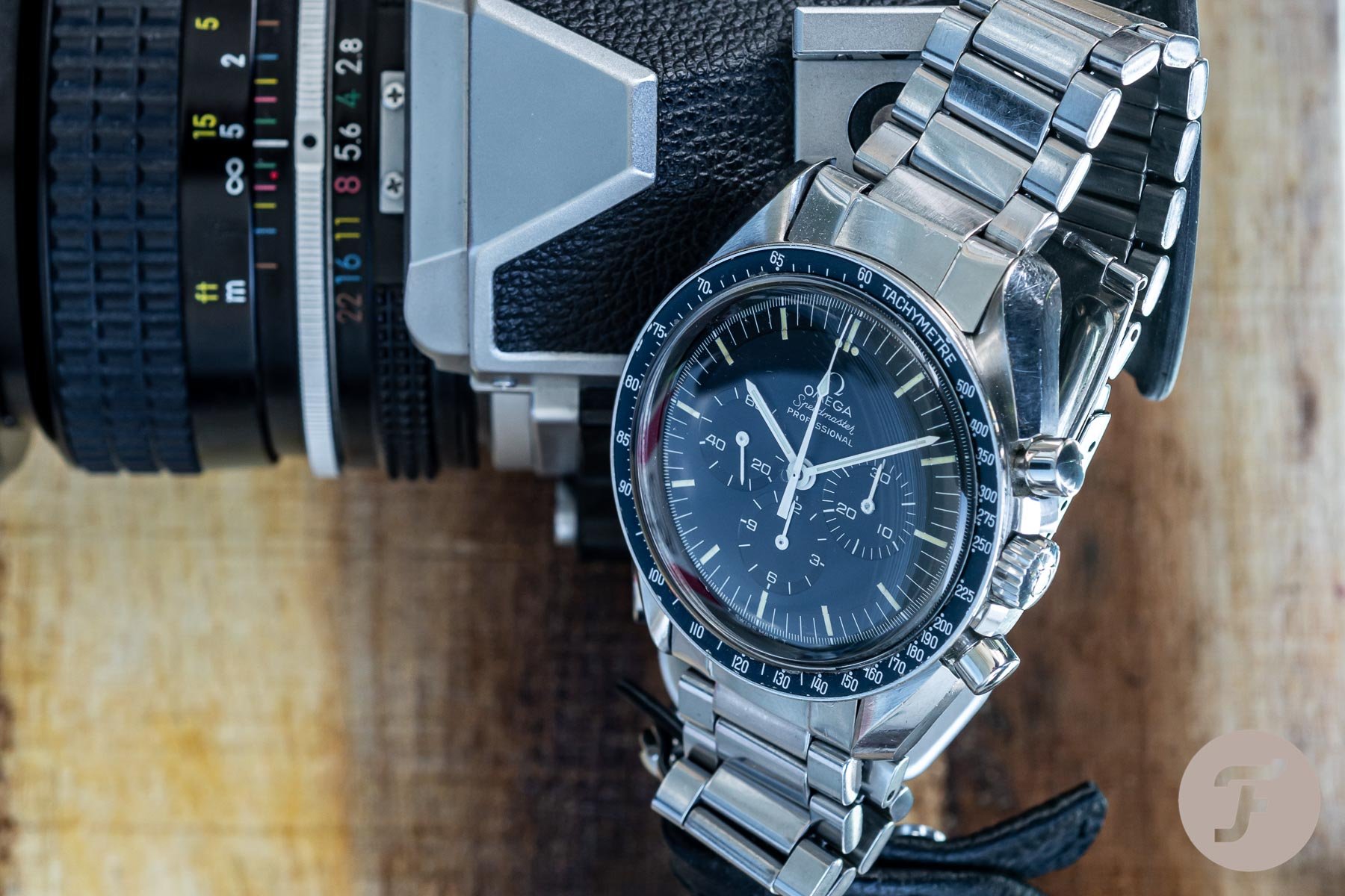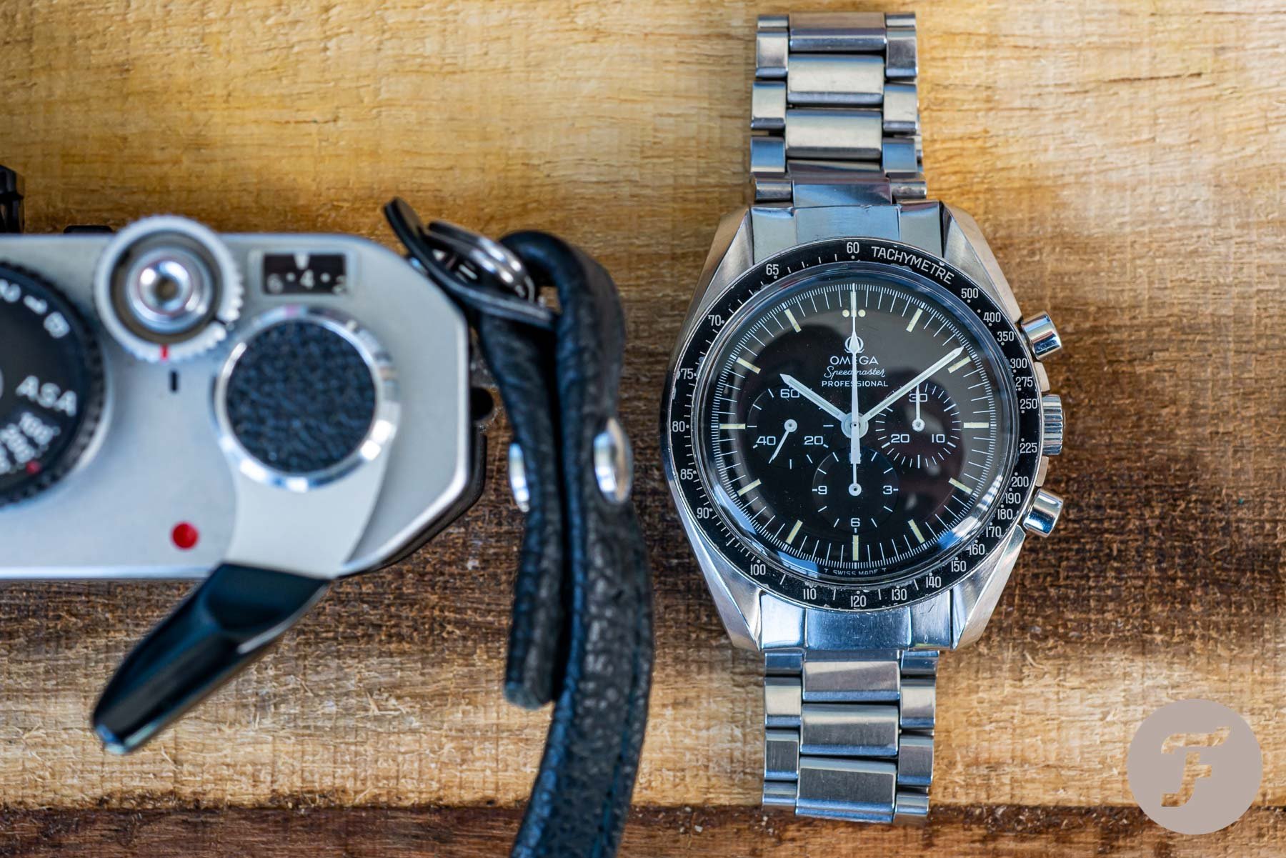 Although I do have a — fully serviced — 321 Speedmaster in my collection, I feel more comfortable wearing this one with caliber 861. 321 spare parts have become scarce and expensive. A watch with caliber 861 is still relatively easy and cost-effective to service. I must admit, however, that the applied metal Omega logo and the teardrop secondhand of caliber 321 Speedmasters both add an extra “pop” to its vintage appearance. But the flimsy bracelet of my Speedmaster here above makes a good deal up for that. By the way, if you think you’re able to guess the camera please let us know in the comments.