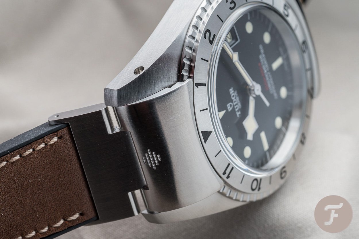 The Tudor Black Bay P01 comes in at 42mm and with a length over 50mm. It only comes on a leather strap lined in rubber that uses a deployant clasp. It attaches to the large endlinks that, at least in one case, have some functionality. The link at 12:00 can be flipped up in order to rotate the bezel in either direction and then pushed back down to lock the bezel into place. The endlink at 6:00 simply overhangs the bezel, but unlike in the original design (it also locked the bezel), it provides no interference. That bezel appears to be an aluminum inlay. As mentioned, the crown is at 4:00 to avoid interference with the wrist but unlike other Black Bay divers, this crown doesn’t contain a spacer between it and the case. The movement inside is the in-house MT5612 chronometer rated automatic. Pricing will be a moderate 3,680 Euros when the watch becomes available in July 2019.