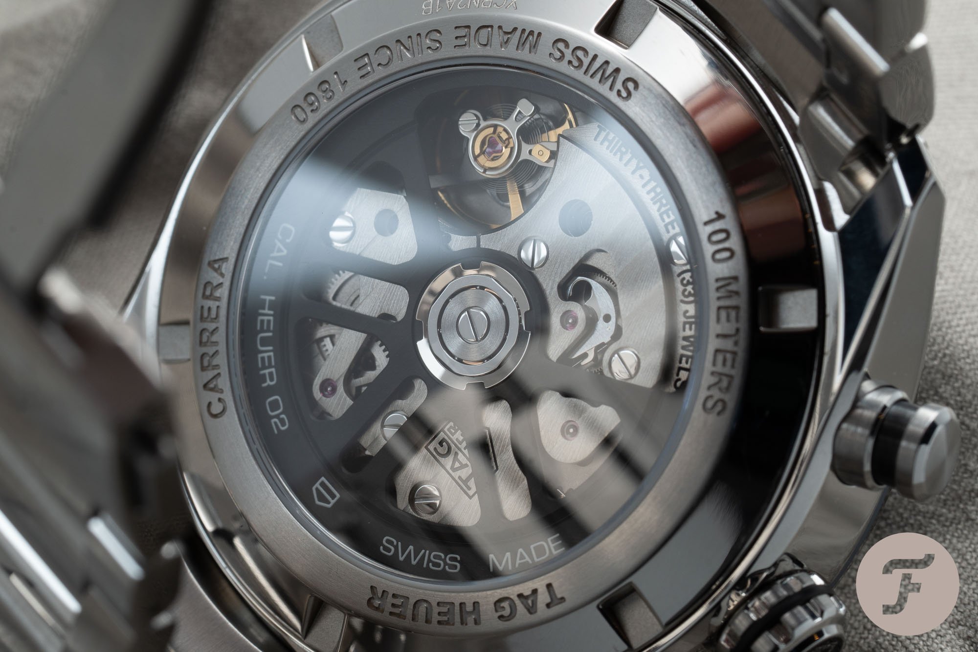 Don’t get me wrong, the B01 is a fabulous movement: It’s rugged, reliable, and in some ways, pleasant to look at too. It’s a shame Tudor hides the mechanism behind an iron wall. So, I suppose we have to trust Tudor on the improvements it applies to its Caliber MT5813. Even so, TAG Heuer develops and produces the Heuer 02, previously known as CH80, in its Chevenez facility. This factory was purpose-built to oversee all steps to manufacture the movement and carry out quality control tests. That’s impressive in itself, and in the Carrera Sport, you can view the fruits of that labor via the sapphire crystal case-back.