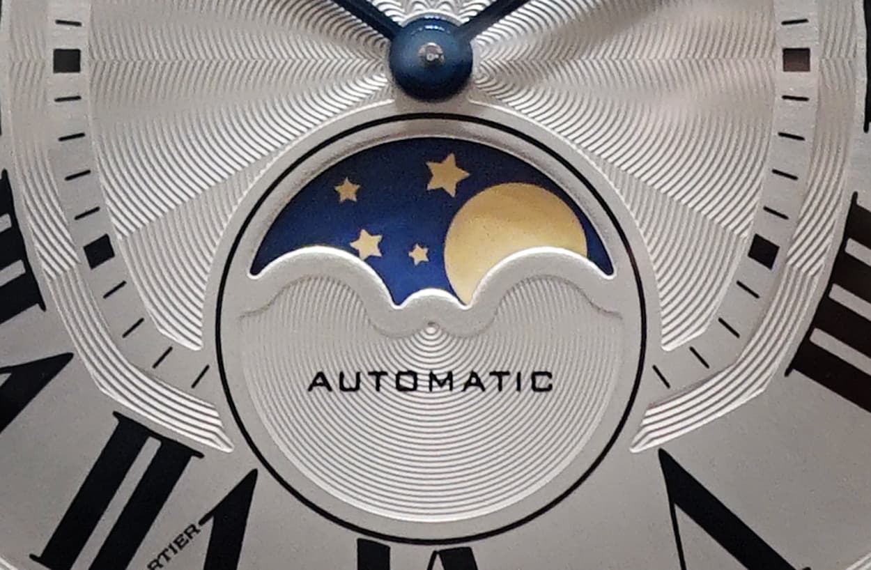 The moon phases indicator looks great on the ‘Drive de Cartier’. In my opinion, much nicer than a moon phases indicator by hand or with a full circular cut-out on the dial. There is no seconds hand and no date indicator on this reference, which results in a very well-balanced dial.
