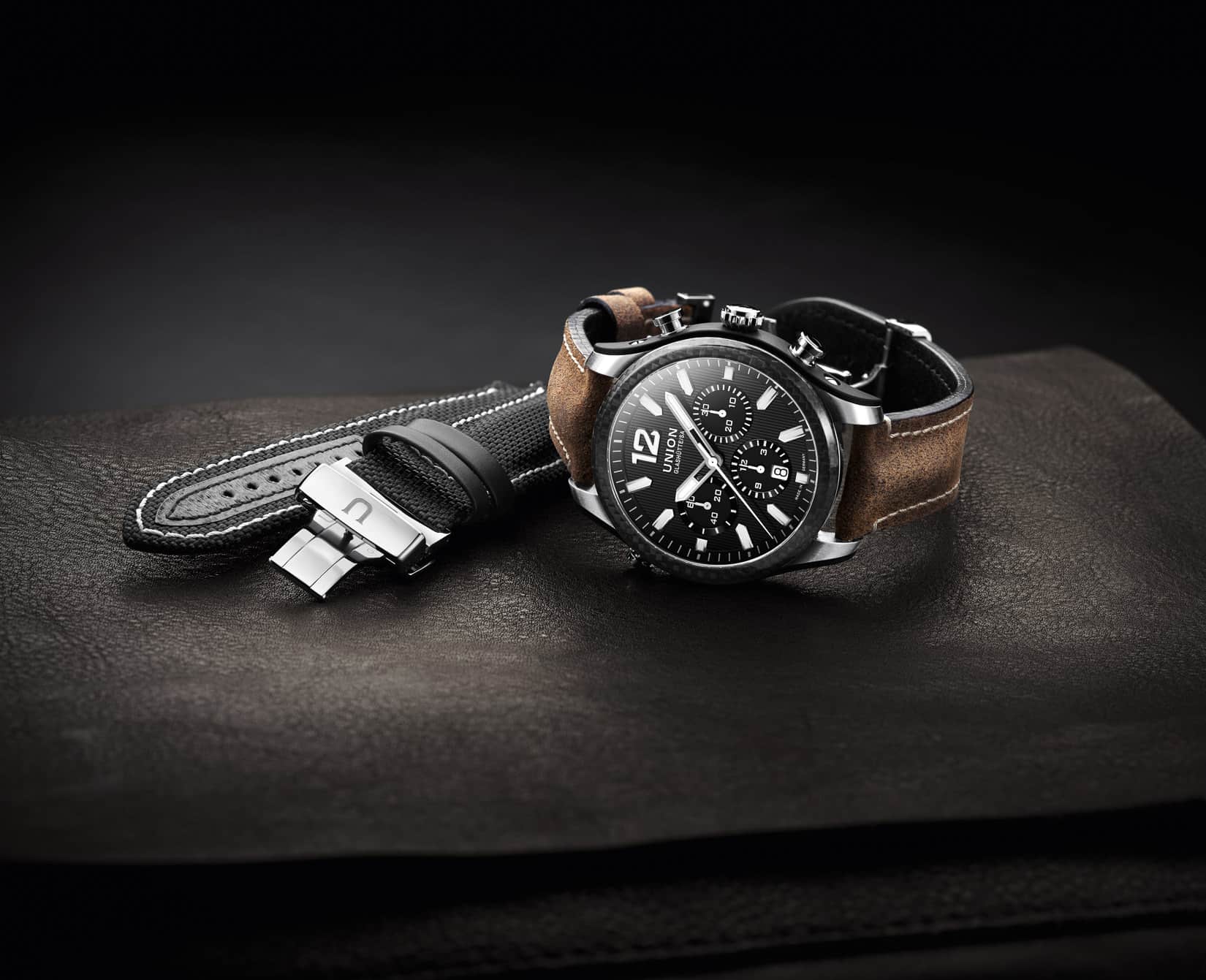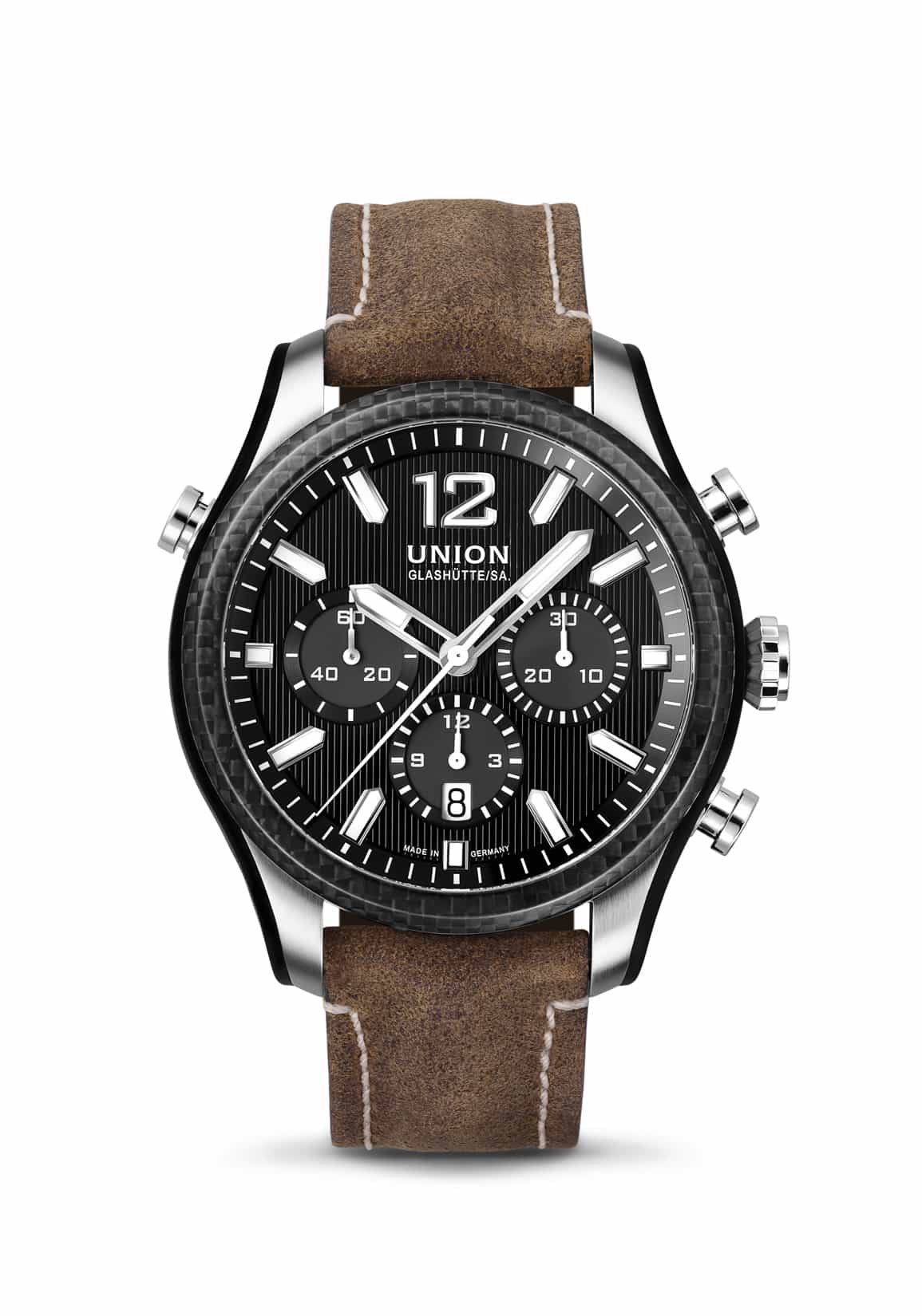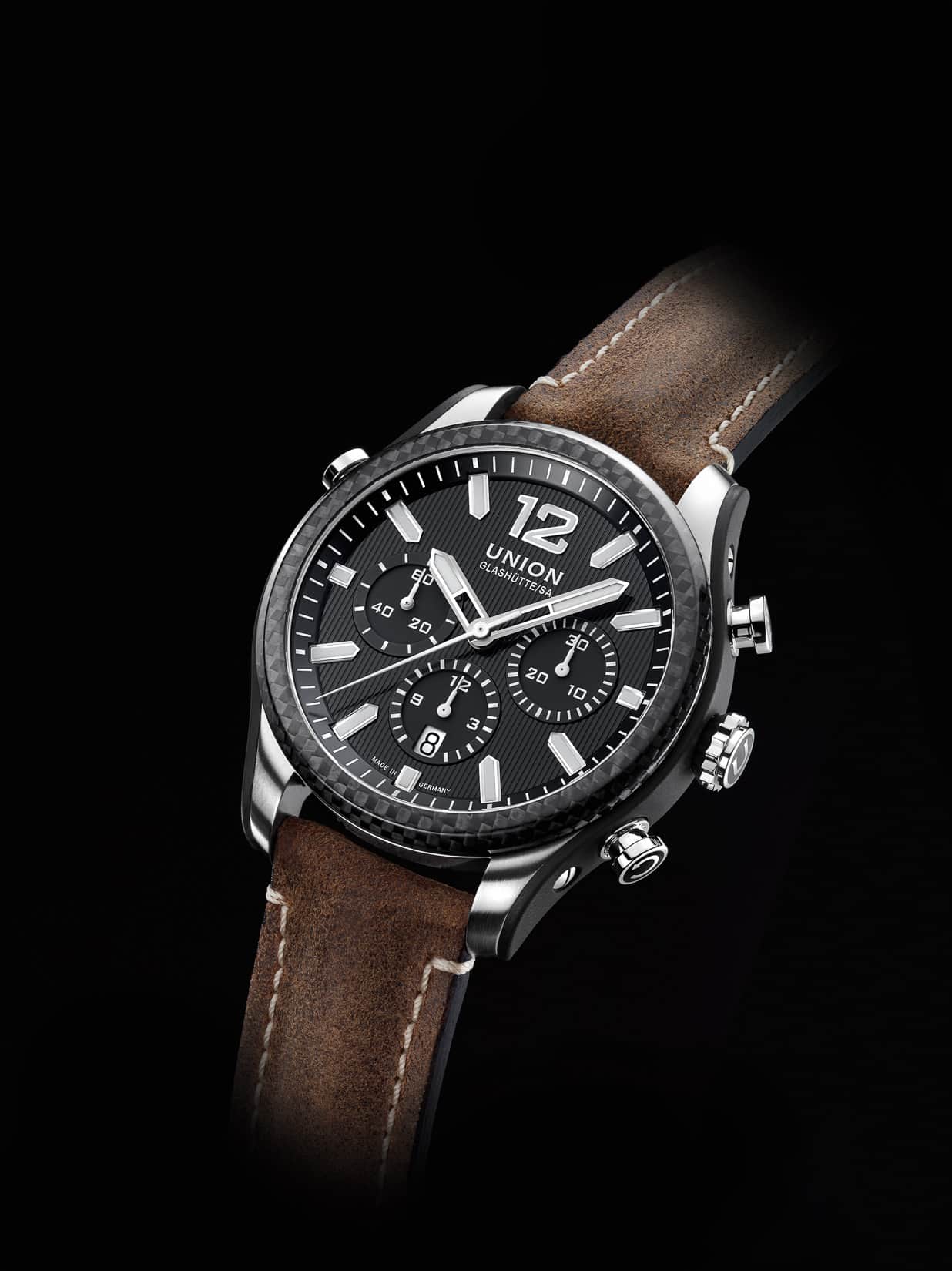 The watch features a vintage strap made of calfskin leather, a black rubber strap and a reinforced fabric strap. They can be changed easily and thus create a new look matching every style. The design features a bezel made of carbon. This material with its classic fibre structure gives the timepiece a sporty feel, highlighted by screwed-down, rubber-coated flanks. The crown and push-buttons feature steel-coloured symbols, inset in black varnish: a “U” for Union Glashütte as well as start/stop and reset icons. The date correction push-button at 10 o’clock is identifiable thanks to a stylised calendar page.