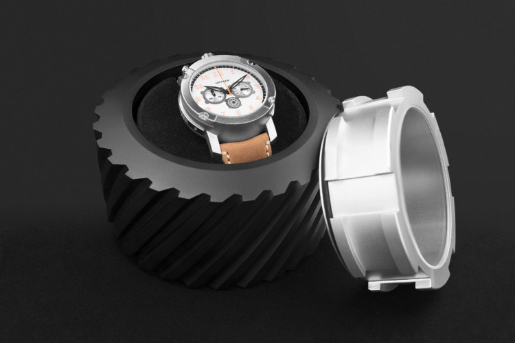 In addition, packaging is a fundamental element for Unyber designers and must join in spirit with the watch. That’s why they decided to create a unique packaging made of aluminium that looks like the gears that unite pistons.