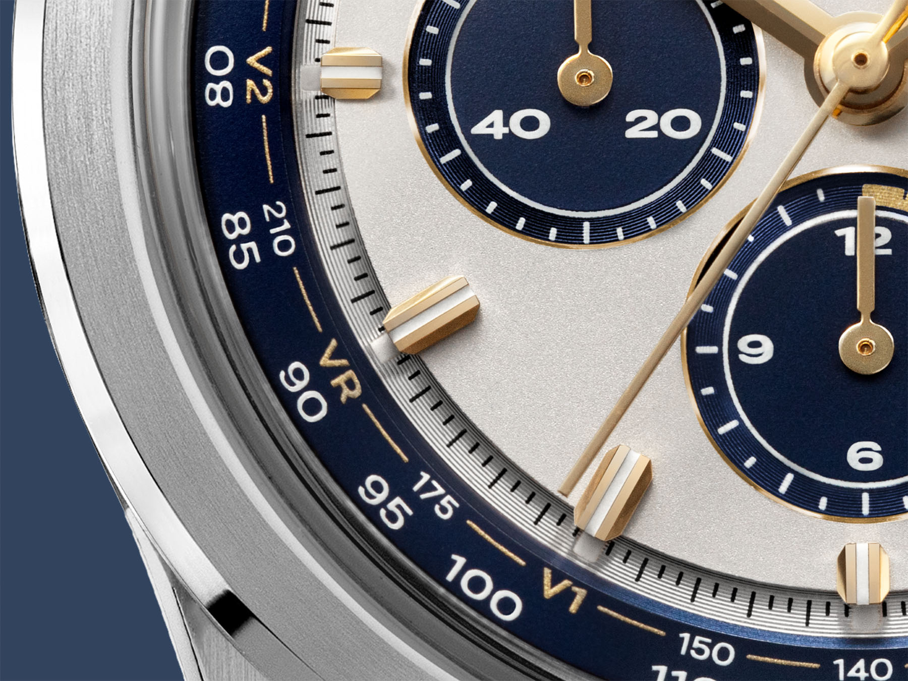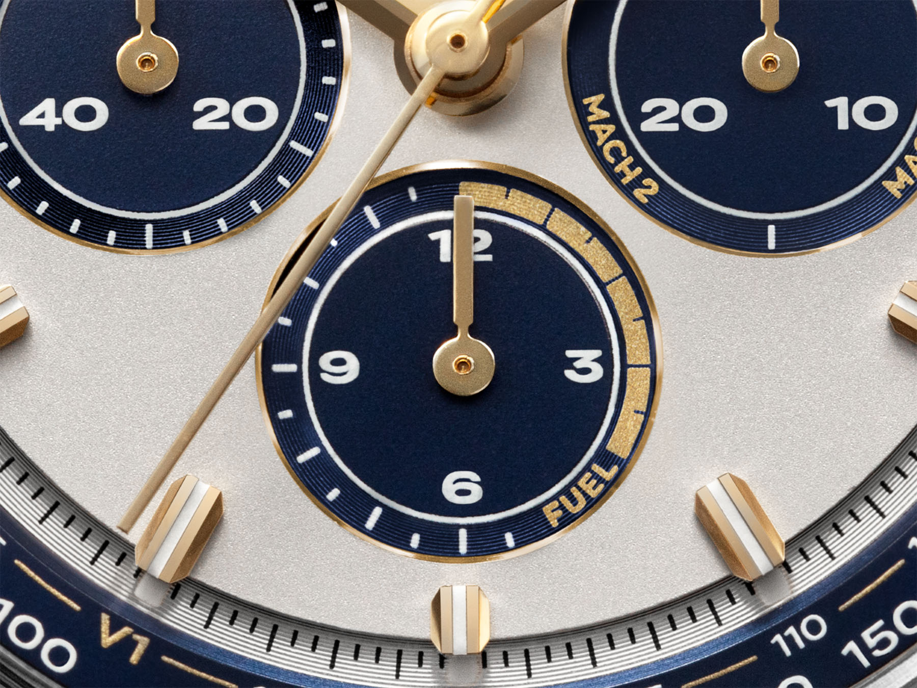 Outside the central portion is a recessed cream-colored ring containing the combined track for minutes and elapsed seconds. The track is encircled by an avio-blue ring that holds the white tachymeter scale and the three take-off phases (V1-VR-V2) of the Concorde in gold. As you can see, it’s a cleverly designed dial full of details hinting at the iconic aircraft.