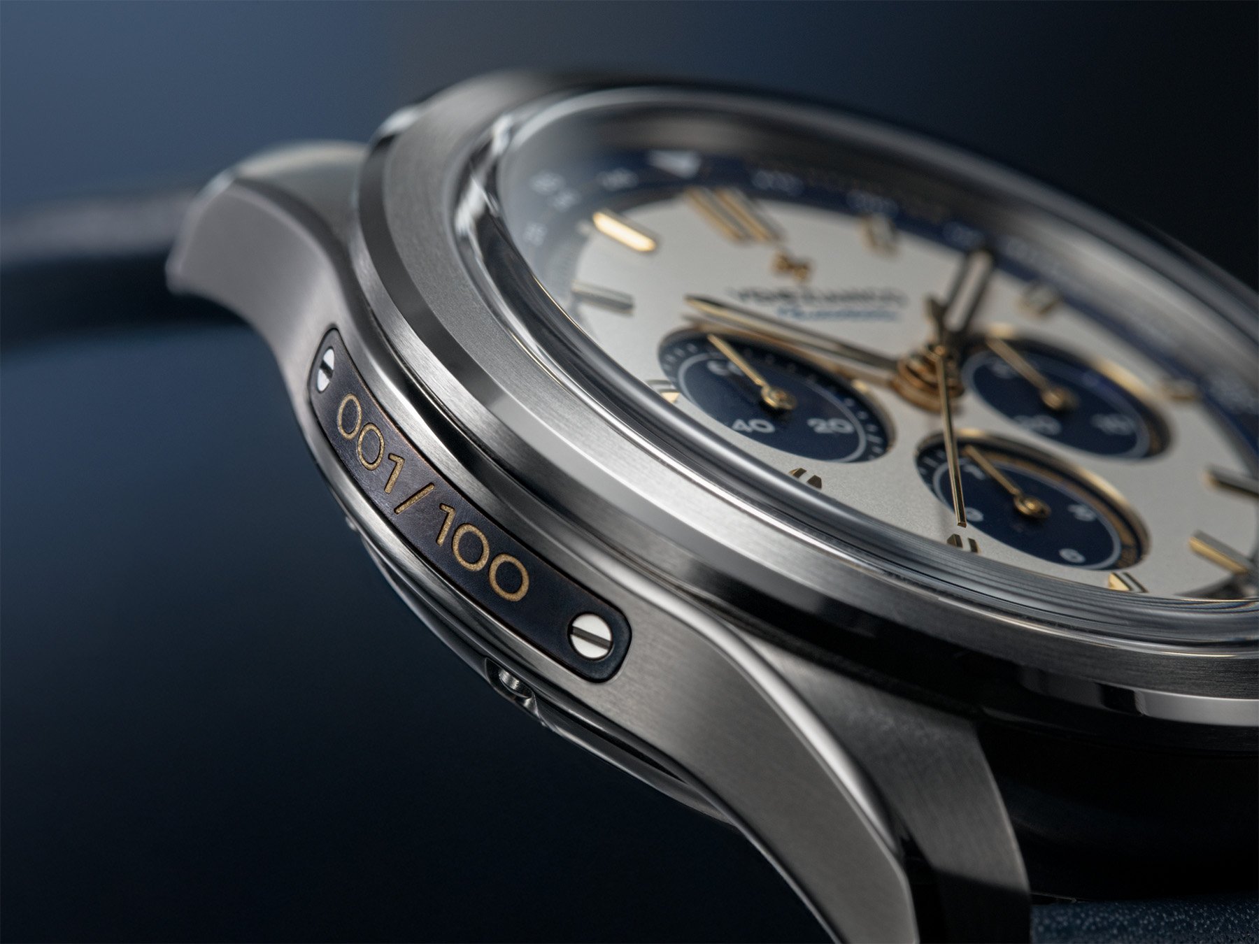 On the case’s left flank, you will find a titanium plate cut from an original Concorde engine blade. It displays each limited edition’s number (xxx/100) in gold. The special titanium-nickel alloy has flown thousands of supersonic hours across the Atlantic and adds a unique touch to each watch. The metal has been reworked and engraved, making this chronograph a true collector’s item.