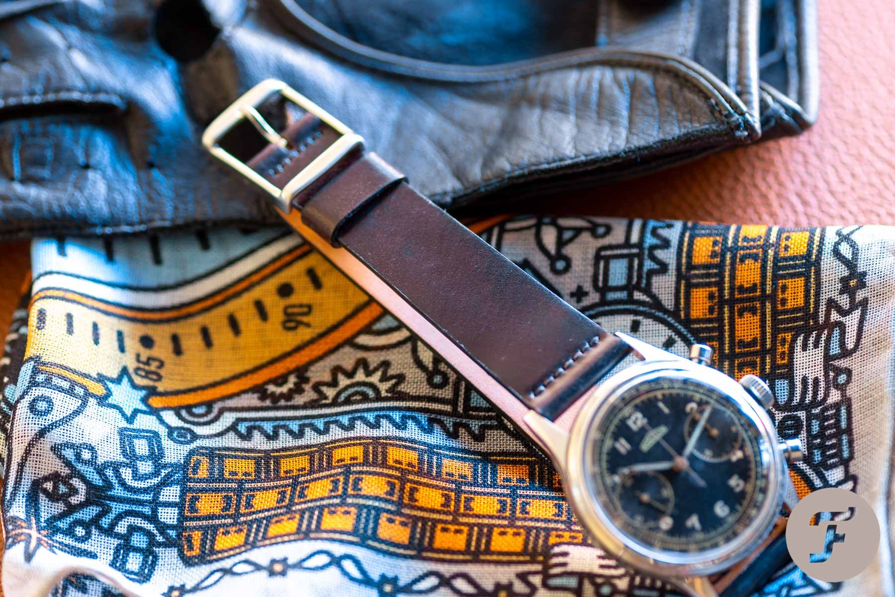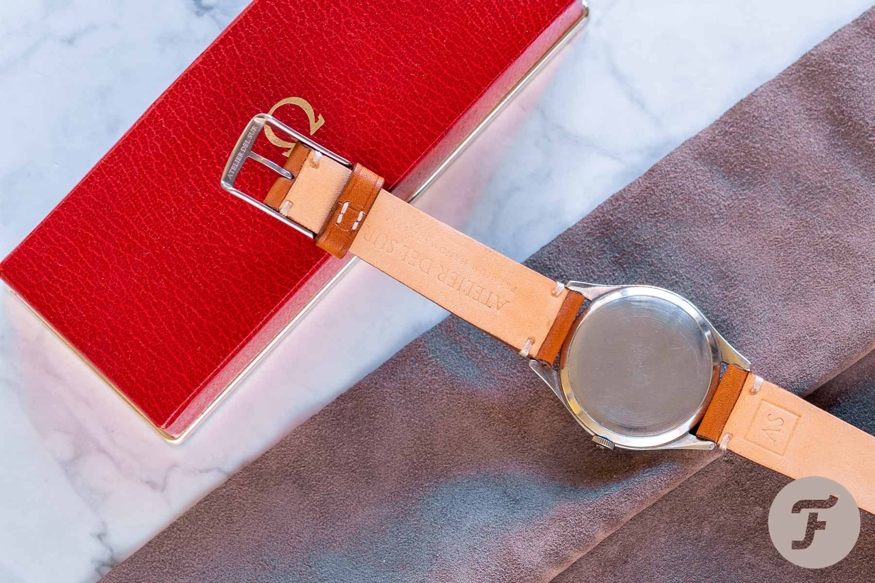 This type of leather is one of the most sought after among ateliers specializing in leather goods. It is extremely robust and beautiful. These Shell Cordovan straps are a treat for any timepiece, modern or vintage alike. We only have a color matching straight stitching on the strap’s lug ends. The edges are painted as well and the buckle is the same as before.