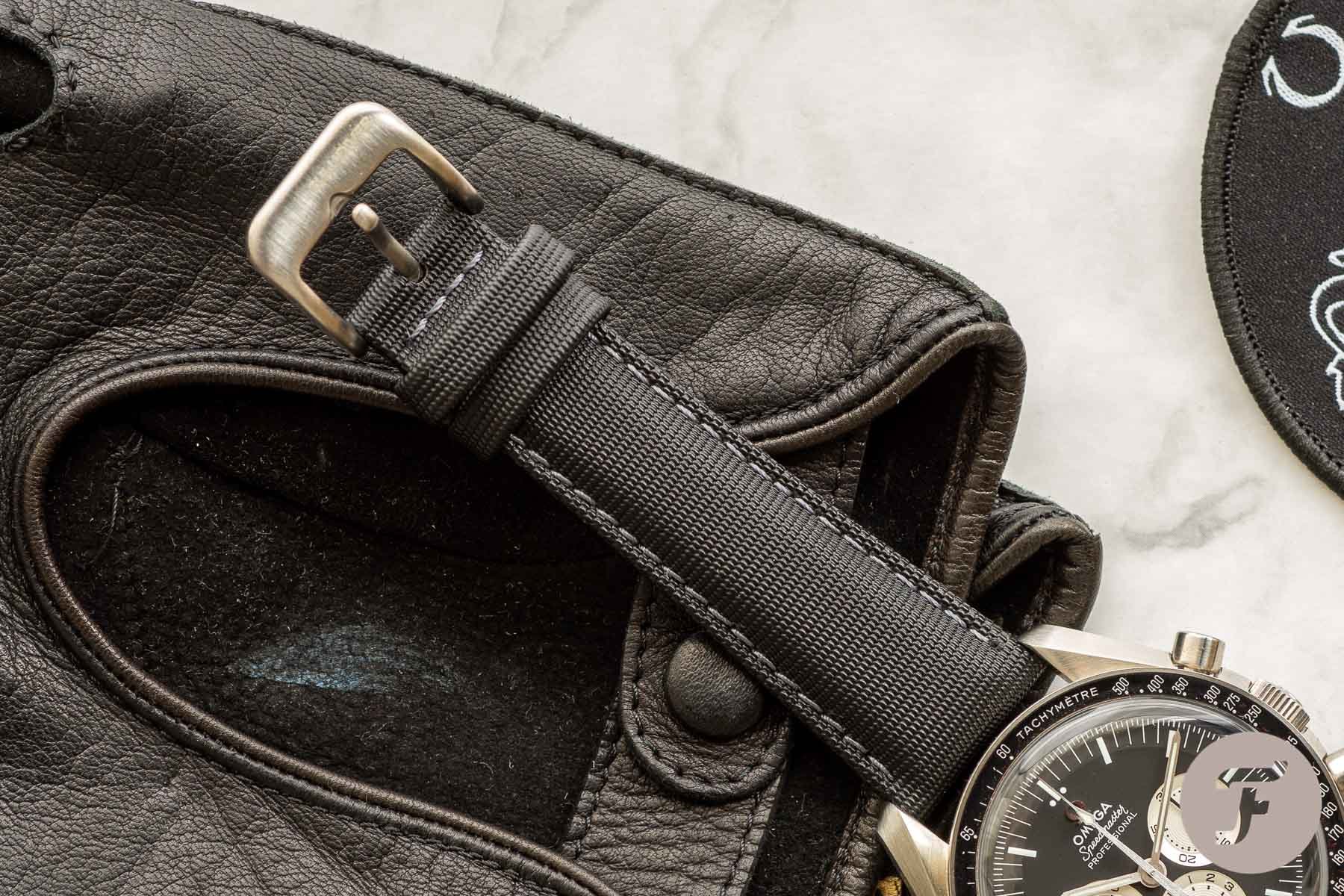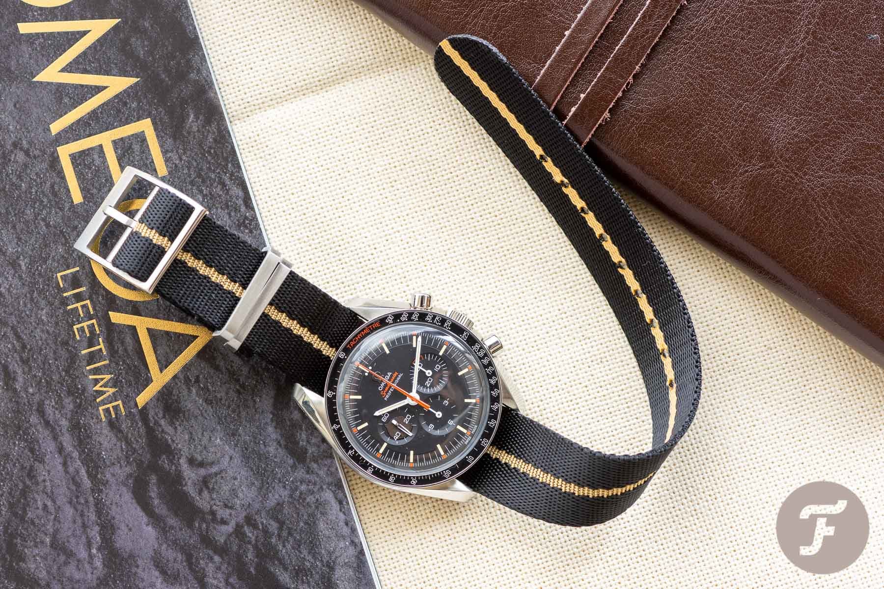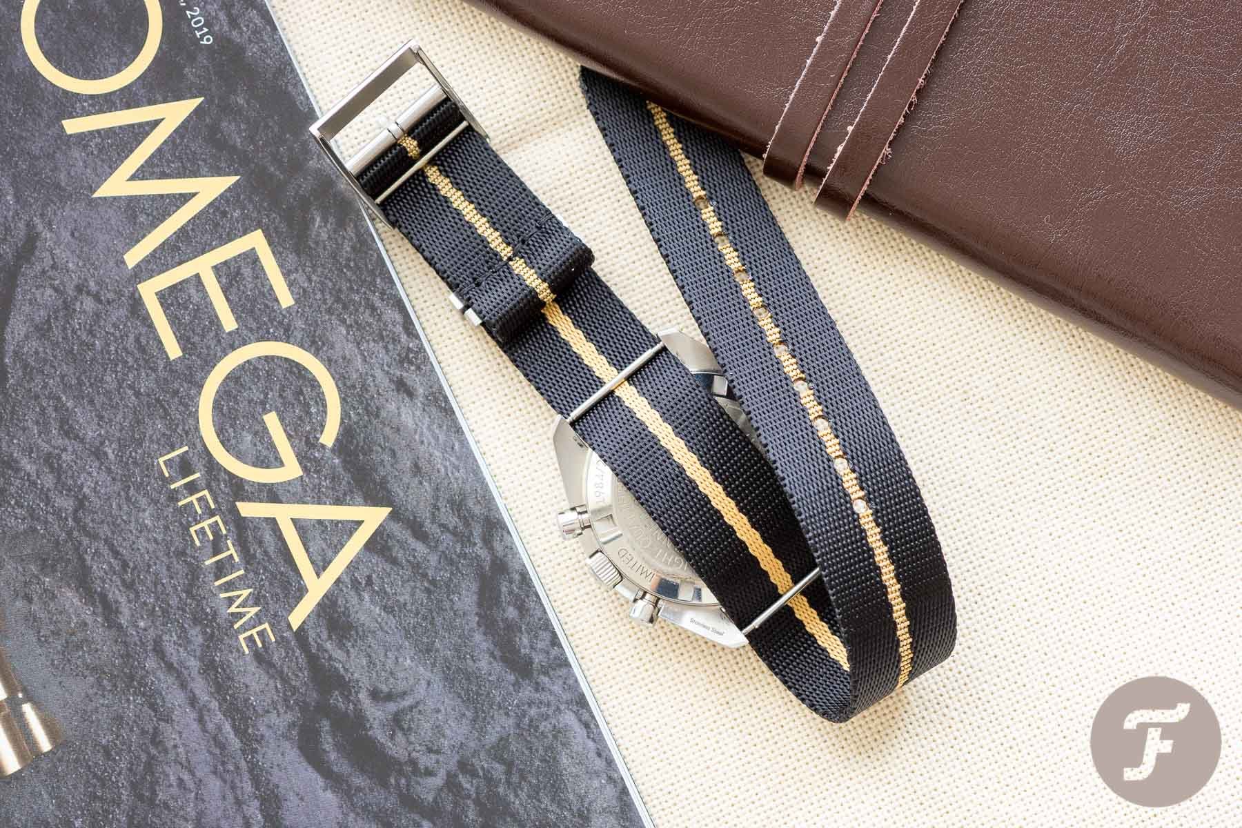 You might need a few days to get used to its stiffness. The strap color is black, but you can choose between grey or beige stitching. Mine is grey and hence the perfect fit for the Speedy. Whereas the smaller sizes have 16mm buckle width, the larger ones (21 and 22mm) come with 18mm. Plus, this model comes with quick-release spring bars —, a nice touch. The strap is tapered, which puts the focus on the watch head. If you fancy one, WatchGecko offers it for €30.99.