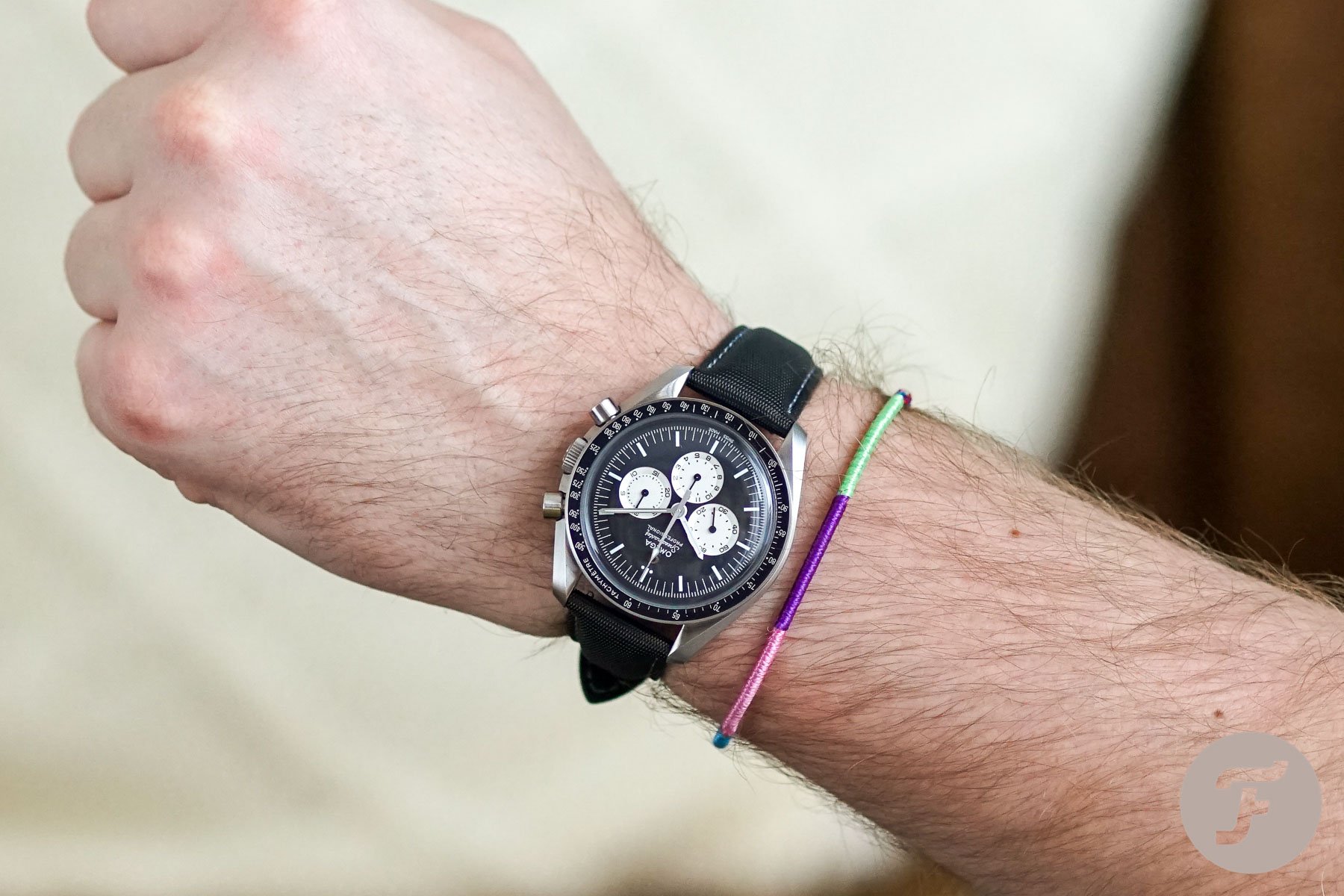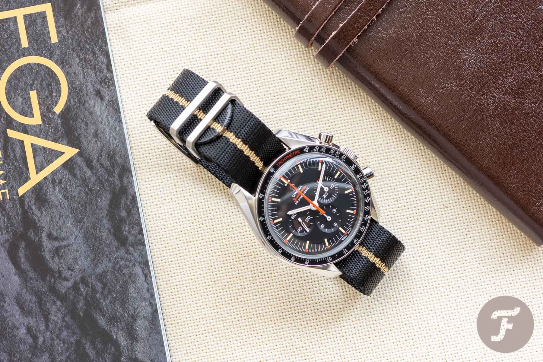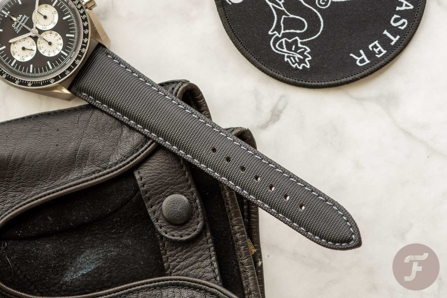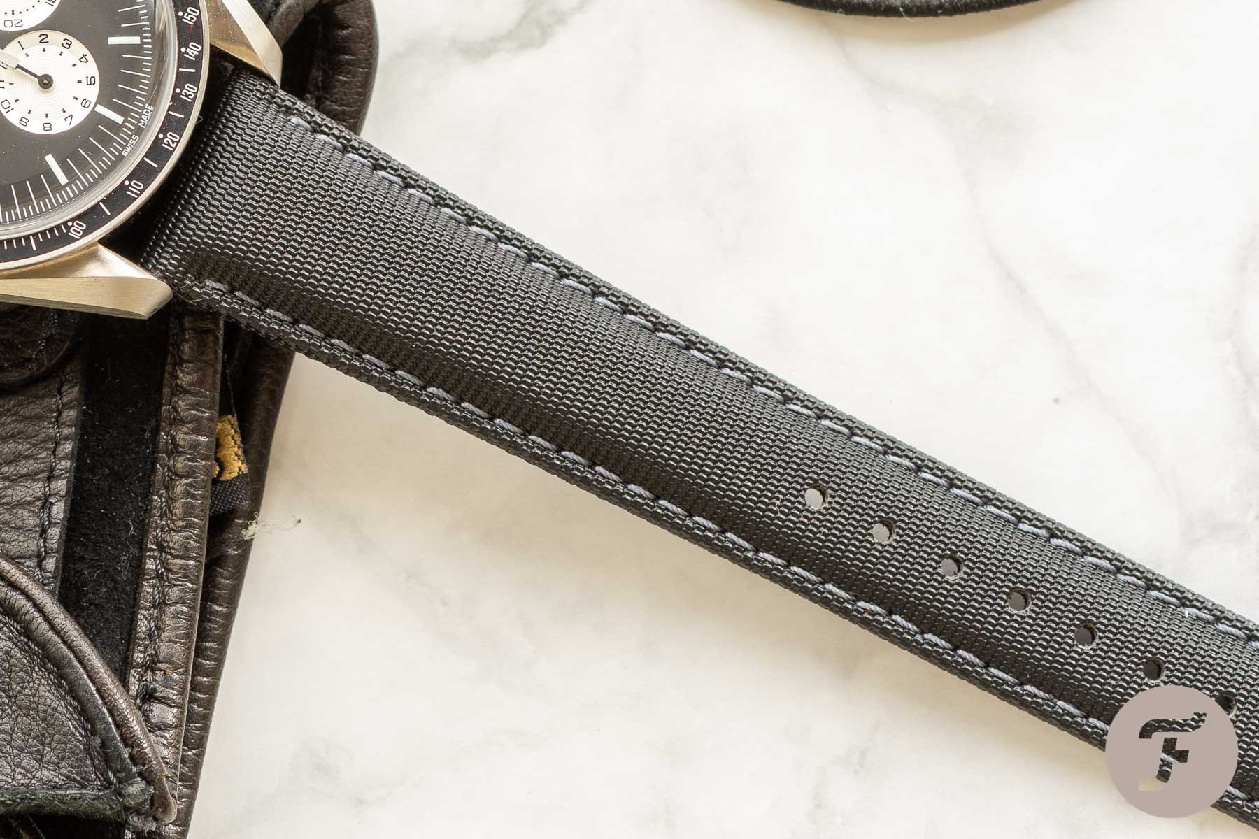 You might need a few days to get used to its stiffness. The strap color is black, but you can choose between grey or beige stitching. Mine is grey and hence the perfect fit for the Speedy. Whereas the smaller sizes have 16mm buckle width, the larger ones (21 and 22mm) come with 18mm. Plus, this model comes with quick-release spring bars —, a nice touch. The strap is tapered, which puts the focus on the watch head. If you fancy one, WatchGecko offers it for €30.99.