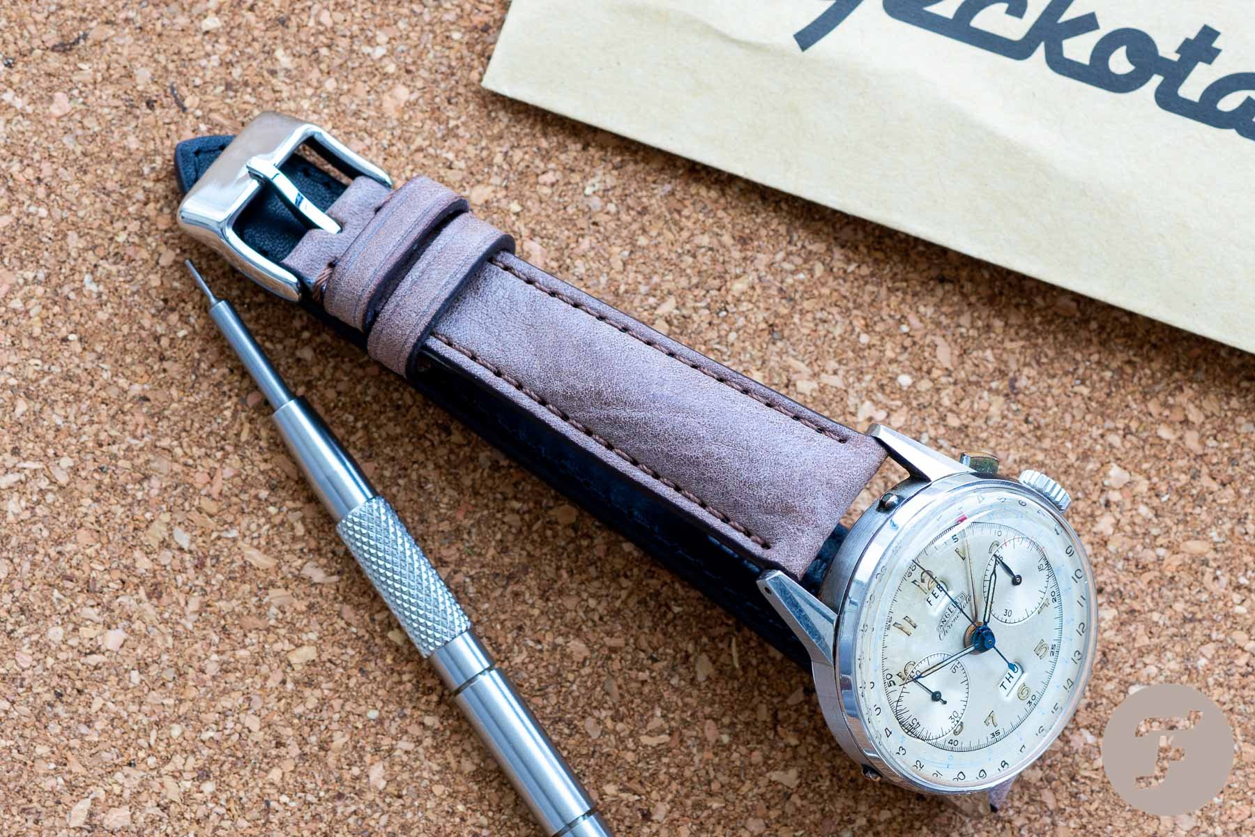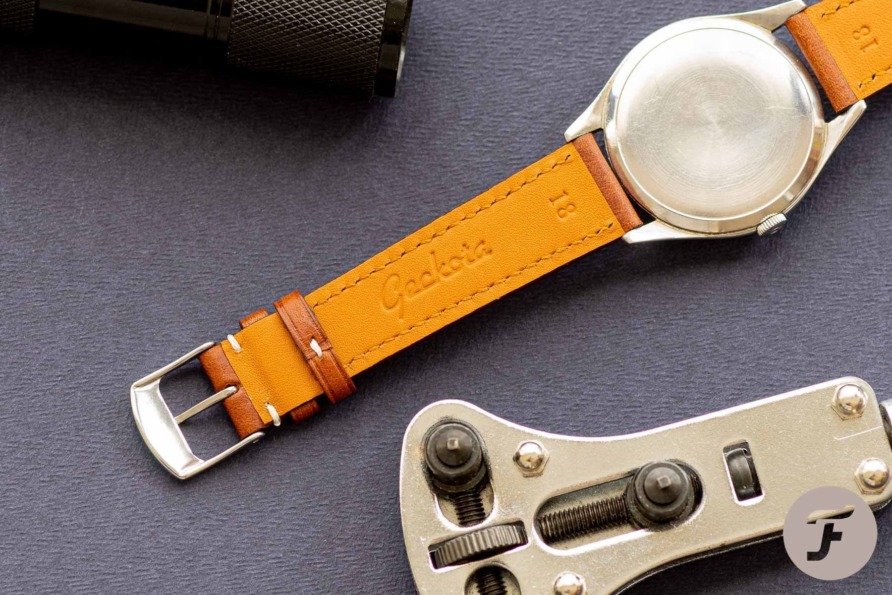 You can get the Besford in six colors, from orange to teal. There’s a very subtle tumbled leather pattern on it, side stitching, and double keepers — just like the Highley has. Geckota offers this in 18, 19, and 20mm, but all come with a 16mm buckle making the Besford nicely tapered just how a vintage strap should look like. The leather is soft; you won’t need a break-in period. This strap is shorter (115/75mm) and thinner than the Highley, so I’d pair it with vintage pieces, but I’m sure it looks the part on modern watches too. For a price of €53.99, this is still in the affordable category.