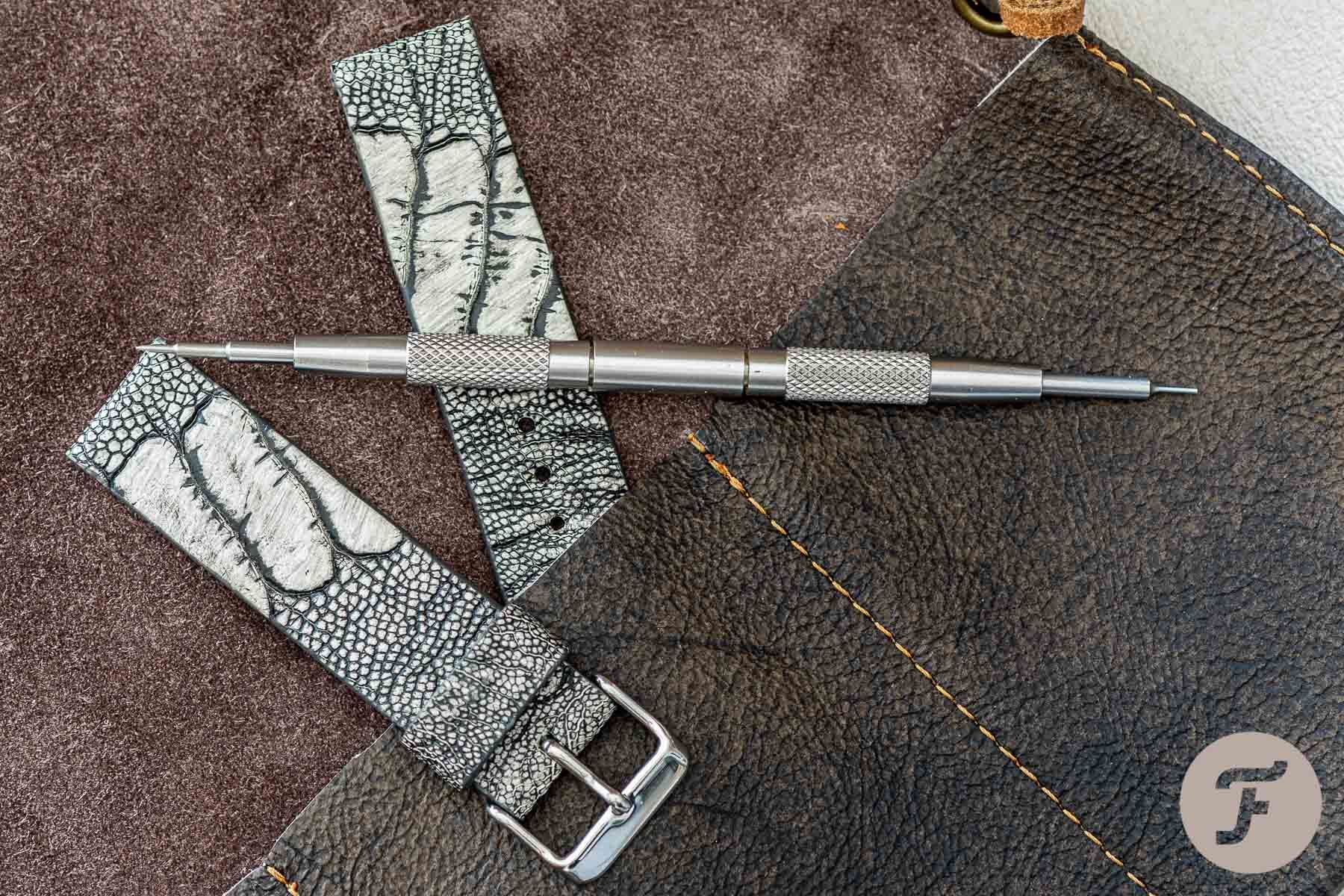 The ostrich leg strap is not for the faint-hearted. Of all the straps that FinWatchStraos sent me, this is the one that stands out the most visually, in my opinion. Granted, ostrich leg straps are super sturdy, and they have a unique pattern that makes them stand out. Just like above, this is also a 20/20mm strap, basically the same form as the alligator. The thinnest part towards the tip is about 2.3mm the thickest close to the lug end is 3.8mm. Yet, the difference is nuanced and hardly recognizable.