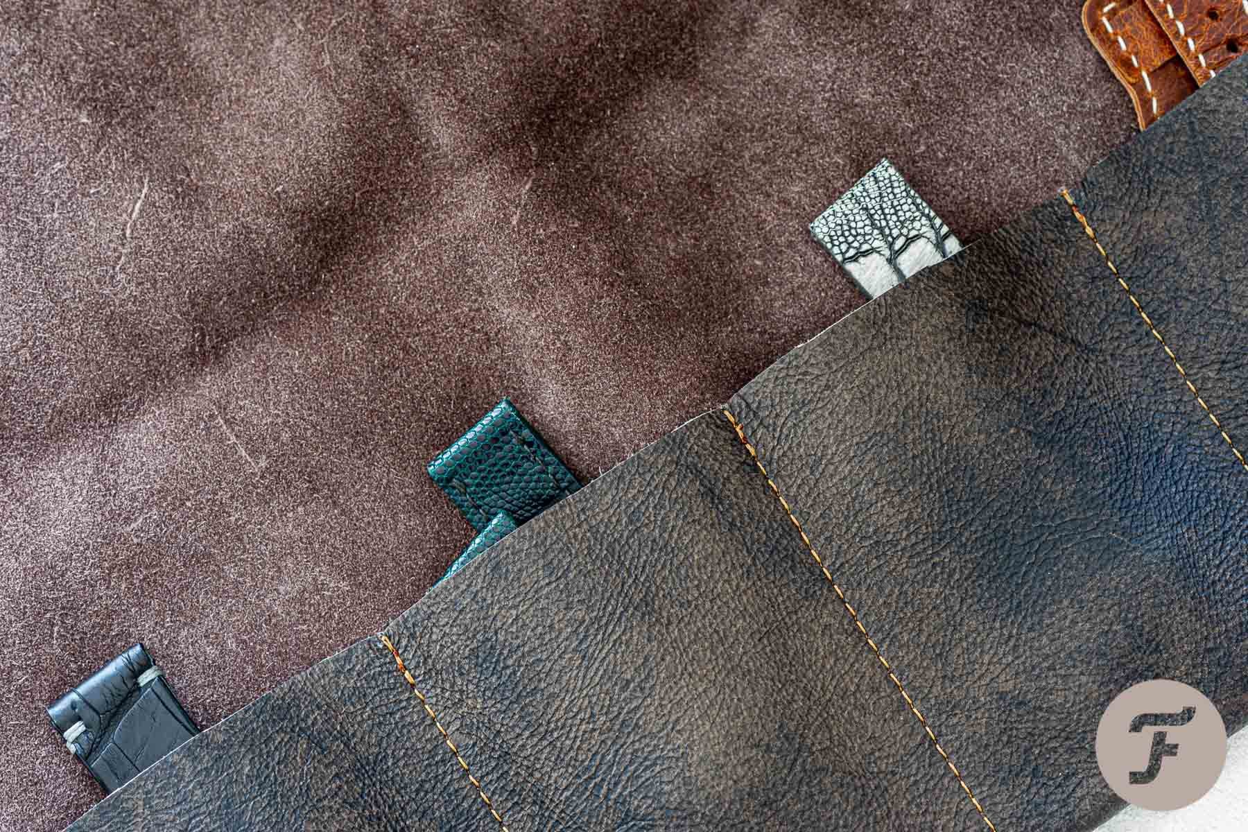 Finally, the straps came wrapped in a four-slot leather watch roll. Like many of you, I have quite a few rolls, but there’s always room for one more. The pockets are 8×10cm allowing them to accommodate even larger pieces like a Panerai. FinWatchStraps offers you its rolls from one pocket (is that even a roll?) up to eight slots. Price will vary depending on how big the roll will be. This four-slot option comes in Italian calf leather and costs you €54.