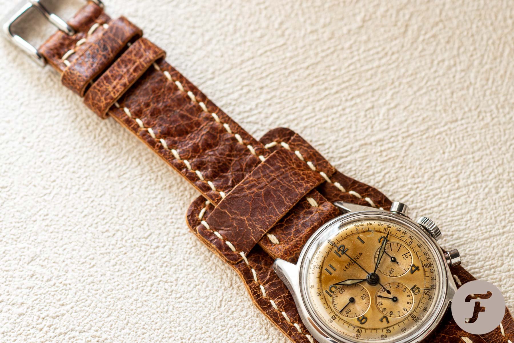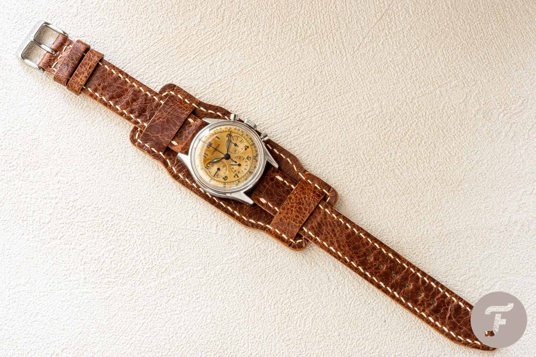 I’m incredibly proud of this combo: the bund-style FinWatchStraps band and my vintage Lemania chronograph. Unfortunately, the reindeer strap “cracks” over time, developing a beautiful vintage patine on the strap’s surface. For this, I suggest you try it with a vintage piece. Or why not be bold and throw it on a modern watch? This option is the priciest of all at €270. Yet, like every strap, you have an entirely handmade leather product from a fabric that is not your average €30 20/16mm run-of-the-mill strap.