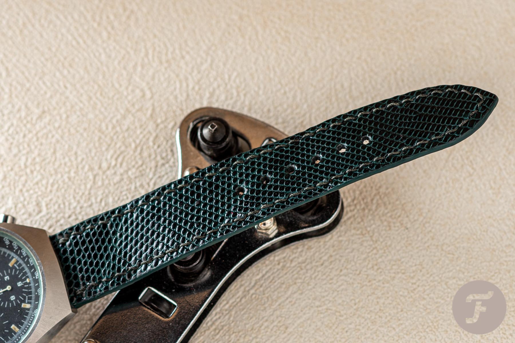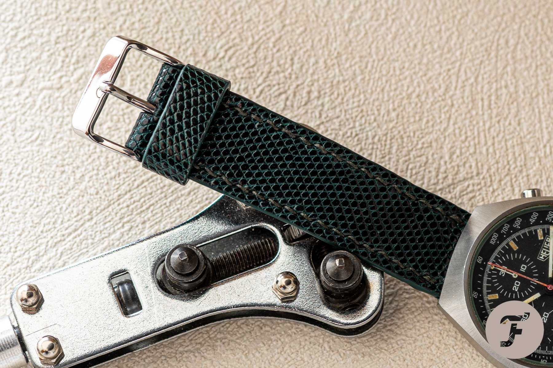 Again, this strap comes in the same size and thickness (2.3mm) as before, and just like the previous two, this one is super easy to wear. What fascinates me, however, is the dark green color. From certain angles, it looks black; from others, it is an almost vivid green. This color change and the lizard pattern create a combination that I can’t hate. I thought that my vintage Heuer would be the perfect watch for it. Especially with the tone-on-tone full stitching. You tell me what you think, but I think I did a good job. Just like the ostrich leg strap, the lizard leather is also a tad over €200