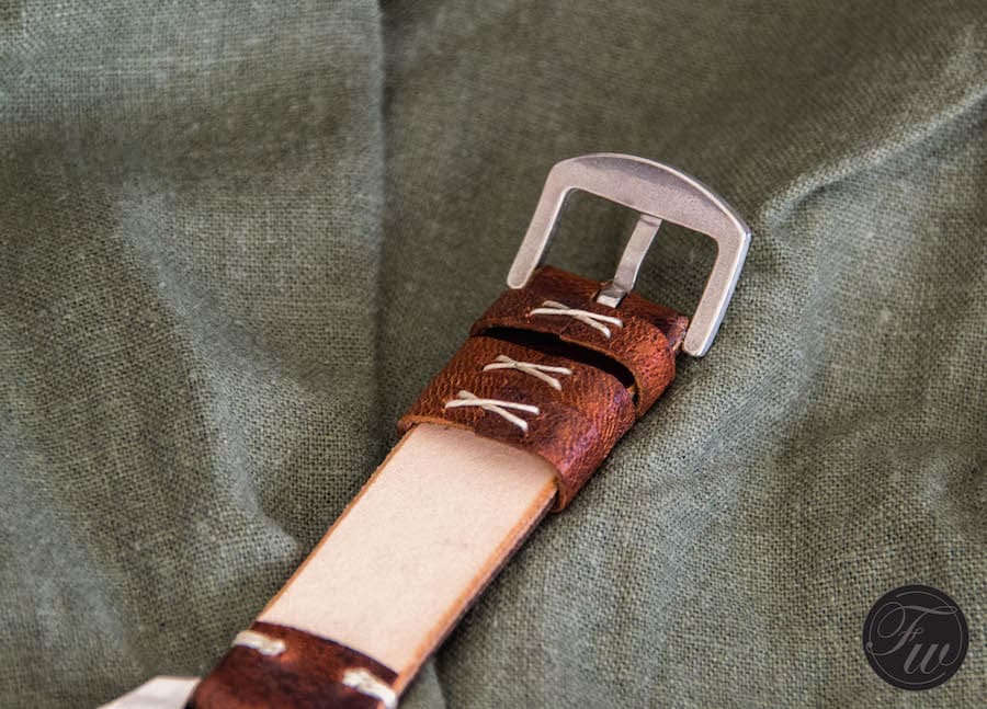 The first strap we take a look at is something Michael calls Aged Cognac. The term describes the strap perfectly. It is a fine even-colored caramel to light brown item where vegtan leather was used from the prestigious Tärnsjö tannery. The leather is superb quality with that original deep raw smell. I don’t even remember when smelled it last. Stitching is cream that compliments the leather perfectly and eases the dressy look of it. The strap is a bit distressed giving each and every piece a unique look straight out of the box. I asked for 20mm ones, which is the size on both ends of the straps, something in my opinion only looks good on larger watches. The buckle you see on the photos comes with the strap but you can also use deployant on them of course. I like the large keepers and the fact that there are 2 only make them look cooler. Flip the strap and you immediately recognize that stitching on the keepers. That’s what I call detail! Due to the color of the strap there aren’t many watches that won’t look great with it. I prefer black dials so for my watches it’s an instant match. Price for this piece is around $70 for custom orders with an extra $15 for shipping. A price you can’t really beat in this category.
