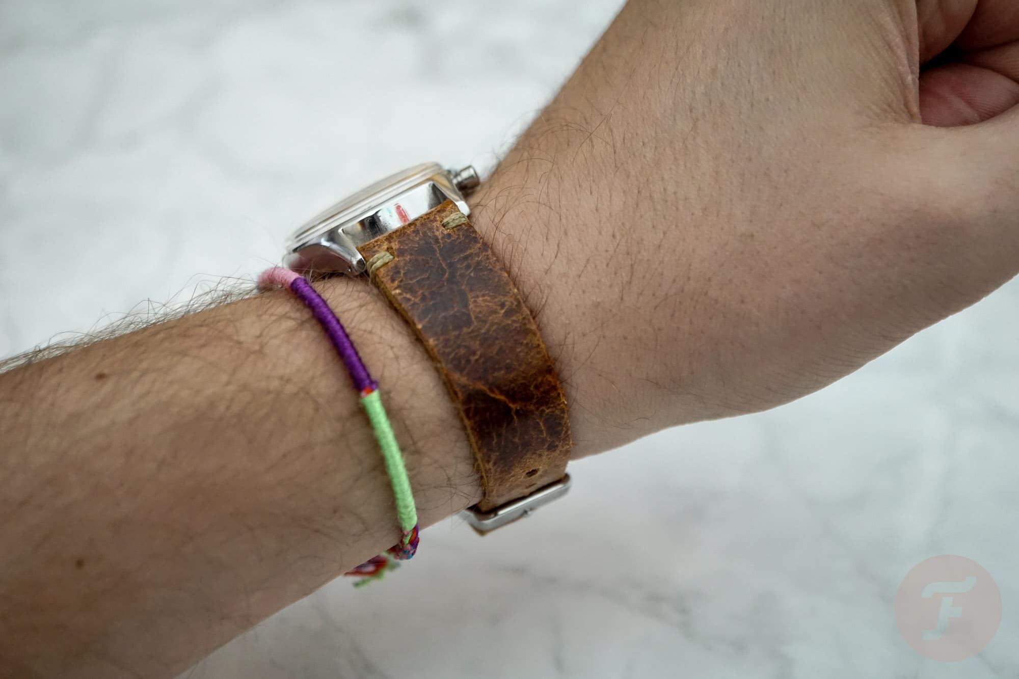 A strap maker’s favourite, these straps are in a number of craftsmen’s assortment. We reviewed a few in the past (here and here). FinWatchStraps uses leather from Swiss, French or Swedish military ammunition bags. These vintage leather pouches need no tannery, time did it to develop a perfect vintage colour for them all. As they develop a patina individually there are no 2 straps that look the same. I received a strap of Swiss ammo bag that according to FinWatchStraps dates back to the 1900s. Due to the thickness of the leather and that it also has leather lining, the strap is rather thick at 3.8mm. Mine have no tapering and are in general a bit stiff. This is again due to the fact that the bags back in the day were made of sturdy leather to withstand military usage.