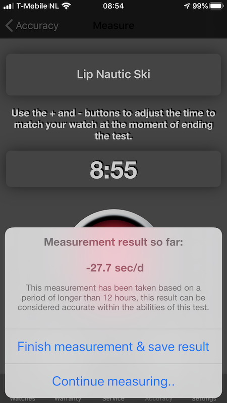 Last but not least, with the last update of the app, which occurred when I was writing this review, another feature was included. A feature to help measure the accuracy of a watch. It works like this. After choosing a watch from your collection one hits a blue (start) button. With -1 and +1 you’ll set the digital time shown in the app to the actual time on the watch. Then, if the watch’s second-hand hits the 12, you’ll hit a green (confirm) button. The results are shown in a way as in the above screenshot. I didn’t have time enough to get some experience with this in order to judge the functionality.