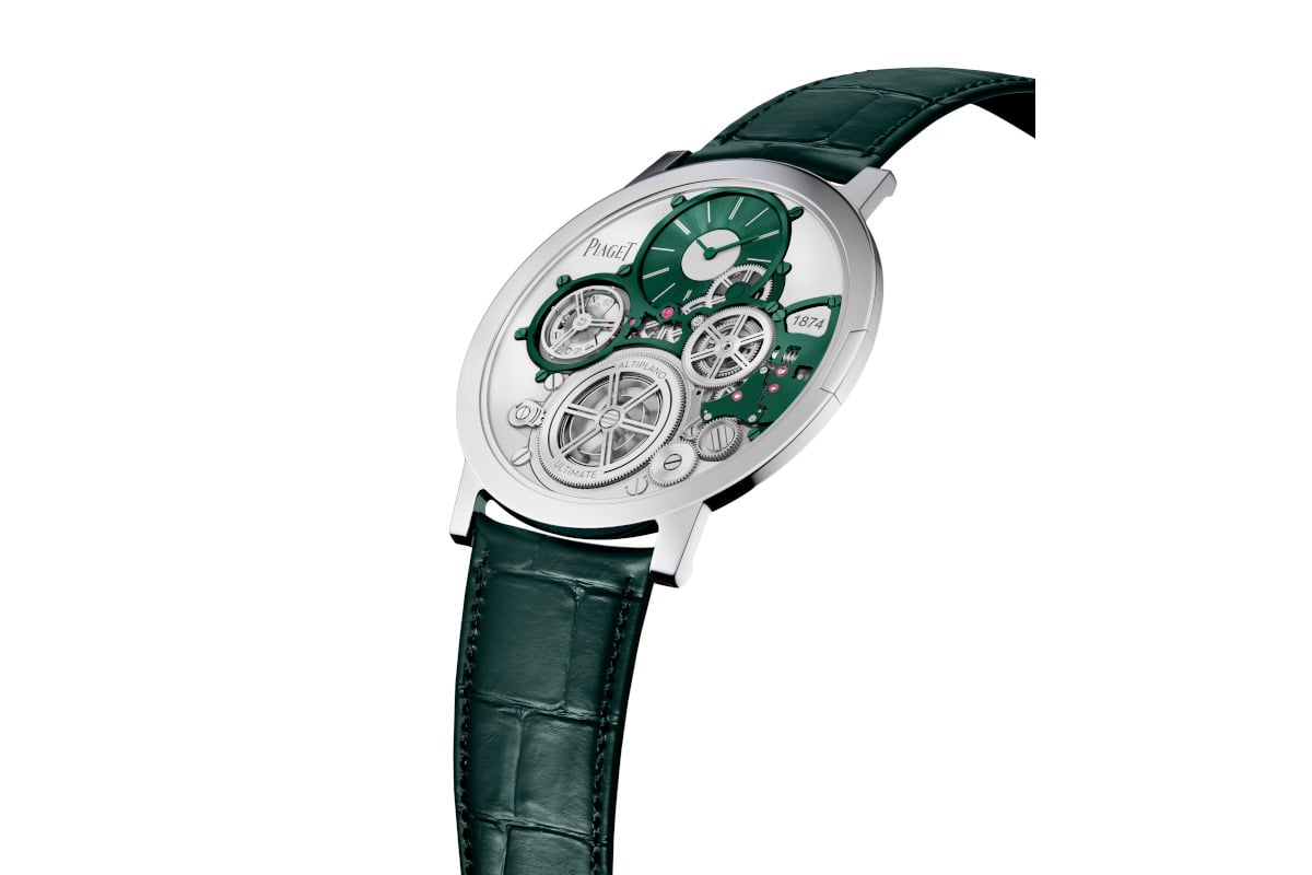 The Altiplano Ultimate Concept tribute to La Côte-aux-Fées has a bridge, screws, hands, and a dial in a deep, forest green and complemented by a matching strap made from alligator leather. The highly-polished cobalt alloy case contrasts nicely with the richness of the green detailing. As a reminder of the company’s heritage, the main plate is not-so-subtly engraved with the year of Piaget’s founding, 1874.