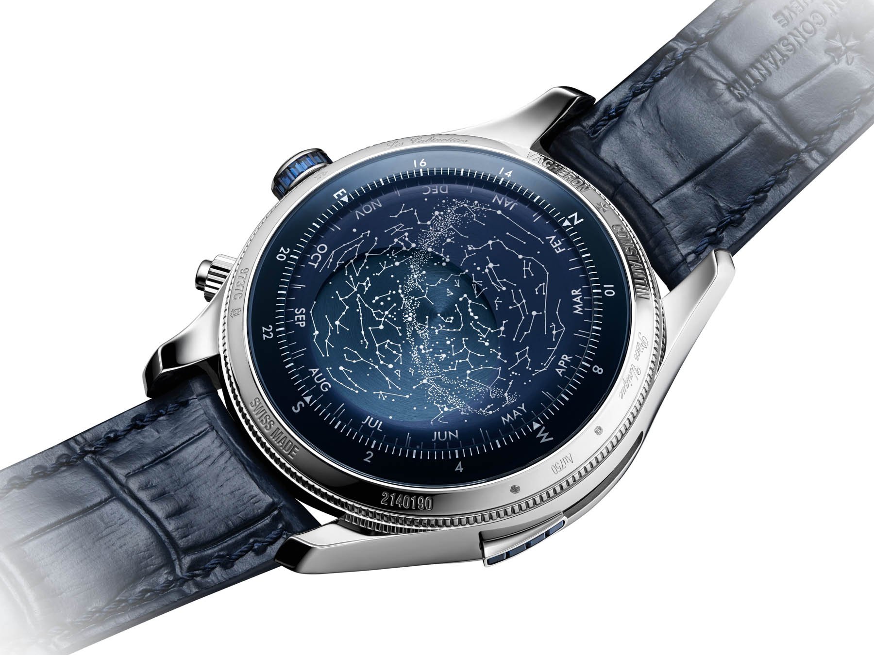 The watch’s back shows a concave star map of the northern hemisphere that rotates once during a sidereal day (23 hours, 56 minutes, and 4 seconds) to exactly represent the positions of the stars in the sky. Sidereal time and the date are also displayed here to facilitate the correct setting of this indication.