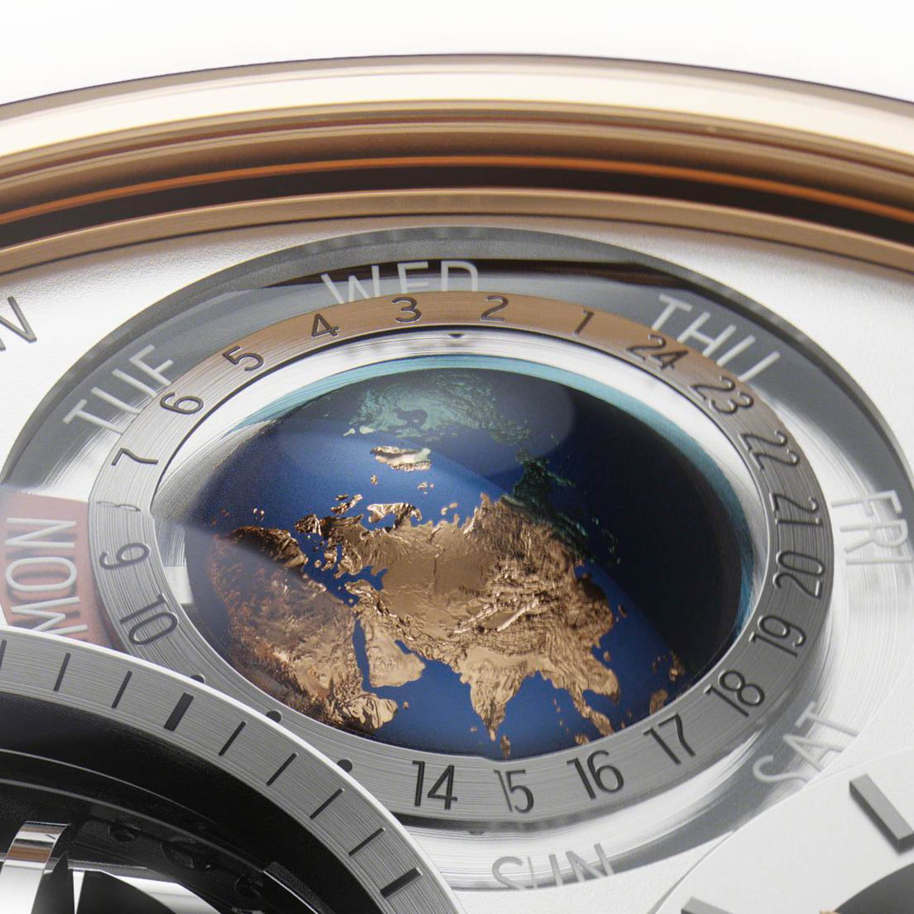 This watch’s design is based on the concept of a perpetual calendar. The focal point of this watch are three rotating globes depicting the earth’s northern and southern hemisphere and the moon phases on both hemispheres. All these globes also provide day/night indications. The current date, month, and day are indicated on circular scales, which is not uncommon for a perpetual calendar. But here, all these are retrograde indications.
