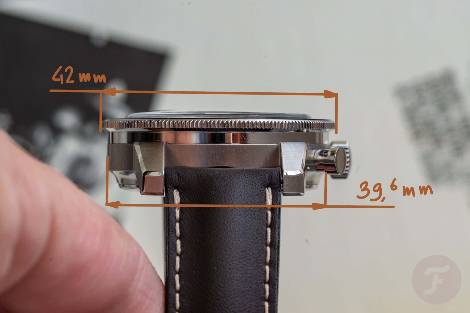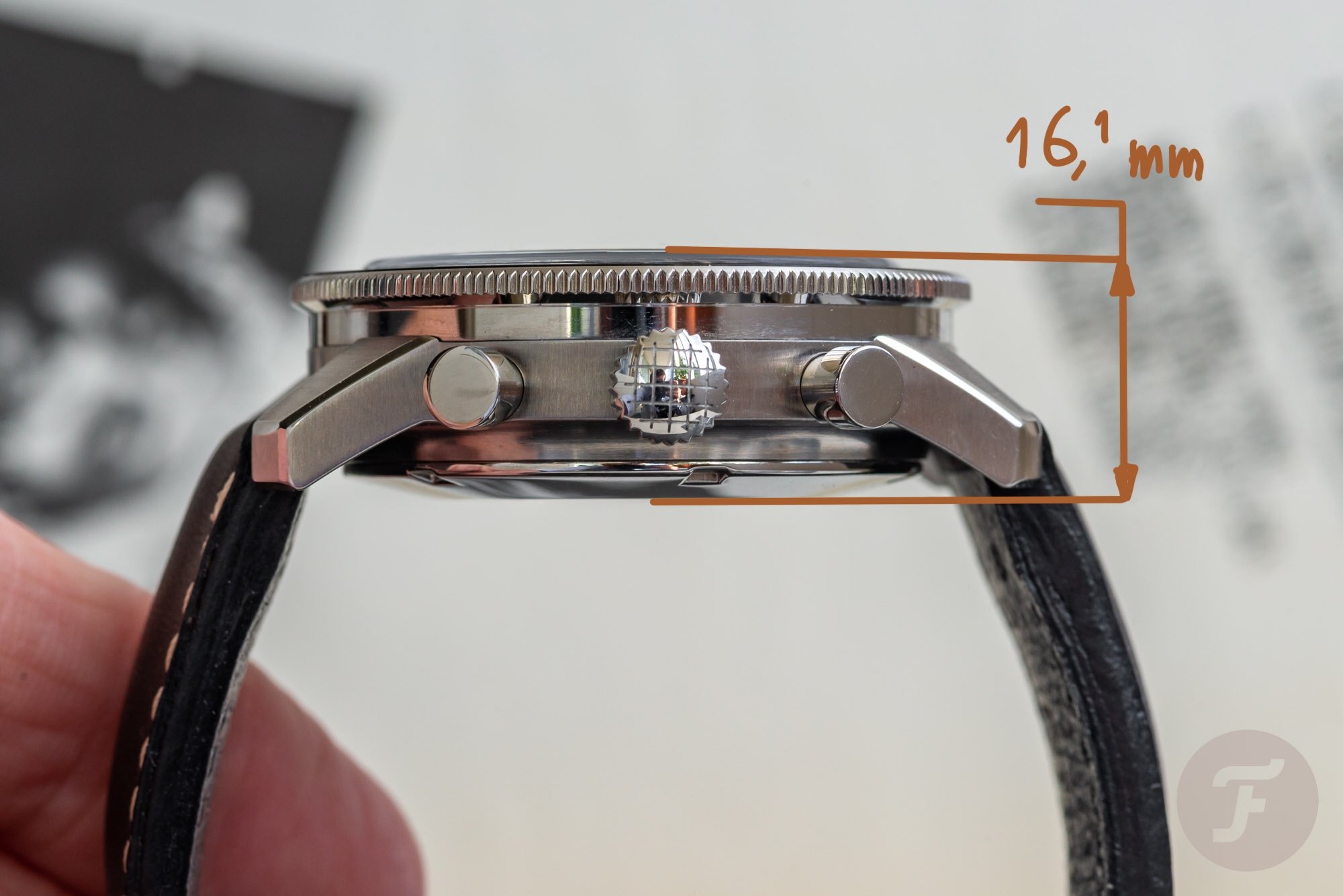 It’s immediately clear that we’re looking at a technically high-quality product here. Beautiful matt black dial with recessed subsidiary dials, high contrast numerals, indexes, and hands. Pretty heavy (106 gr), with an extreme nicely finished case, and fitted on a thick full grain leather strap. The latter in Havanna-brown is precisely my preferred choice. The watch’ specifications are all on par as well. 10 bar pressure tested 316L case, slightly domed sapphire crystal, and sporting a reliable caliber derived from the ever so good Valjoux 7750. In this case, equipped with a Flyback construction.