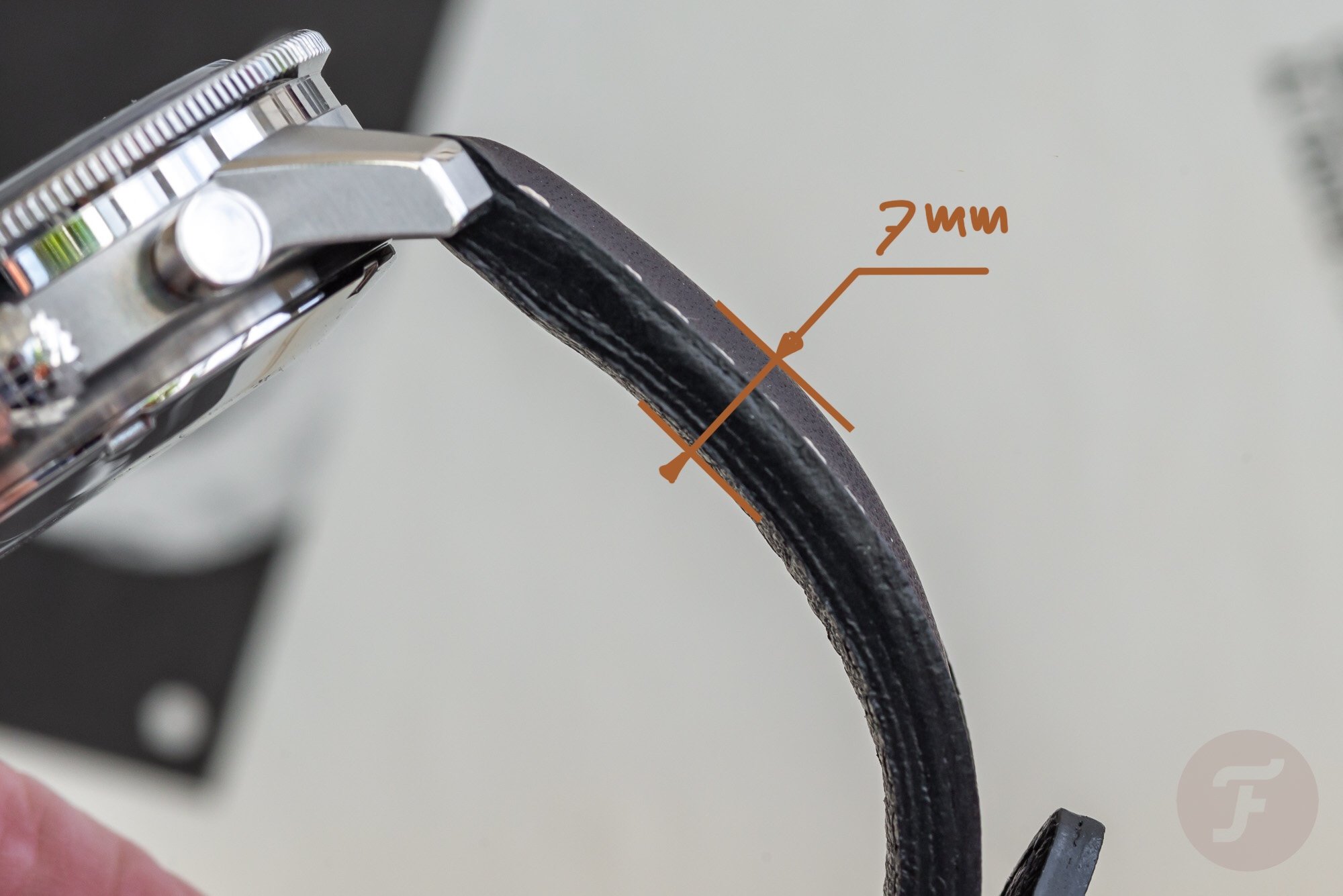 As it’s a beautiful strap and looks good on the watch, I tried to wear it for some days. With its thickness of no less than 7 mm, it didn’t break in though and remained too stiff for comfort. The watch was sitting high above my wrist and turned to either side of my wrist. I had to find another solution to wear it, as this didn’t do it justice.
