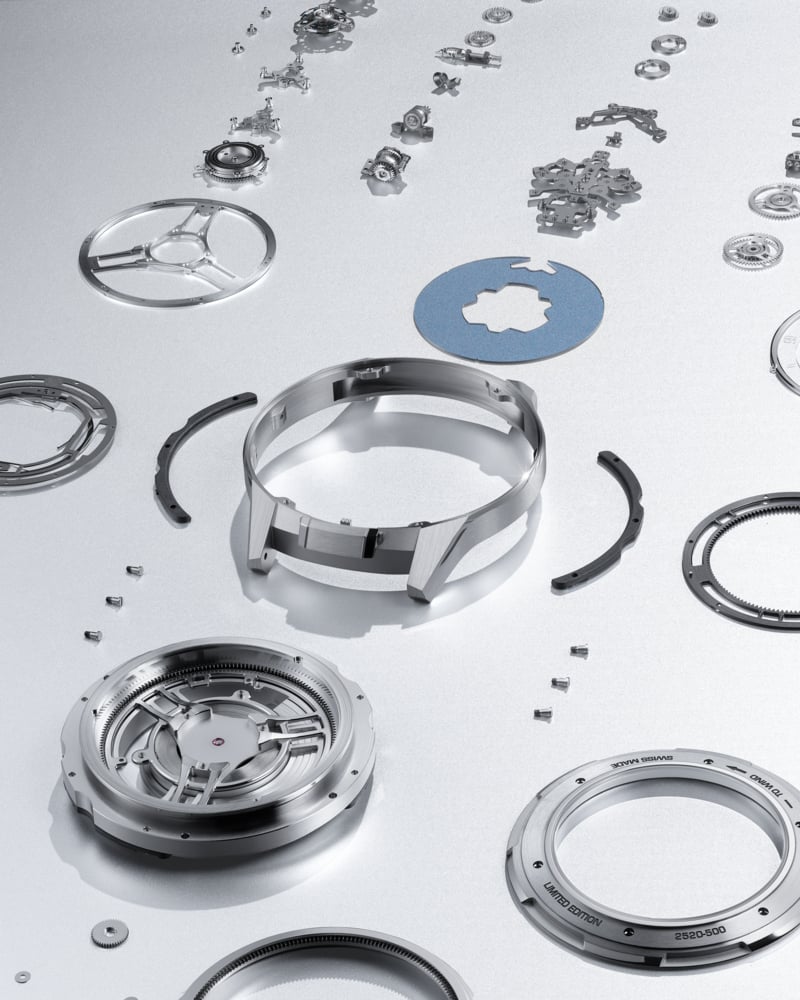 At the center of the Super Freak is the new in-house automatic caliber UN-252, comprising 511 components. It took four years to develop, and it introduces a double tourbillon configuration combined with a flying carousel system. Two inclined flying tourbillons, each set at a 10-degree angle and rotating in opposite directions, complete a full revolution every 60 seconds. These are mounted on a lightweight titanium bridge that also functions as the minute indicator. The entire carousel rotates once per hour, respecting the Freak’s characteristic display format. According to the brand, more than 97% of the movement’s components are in constant motion, with only a small number remaining fixed.