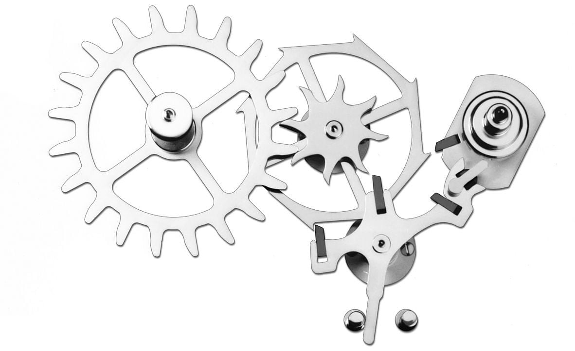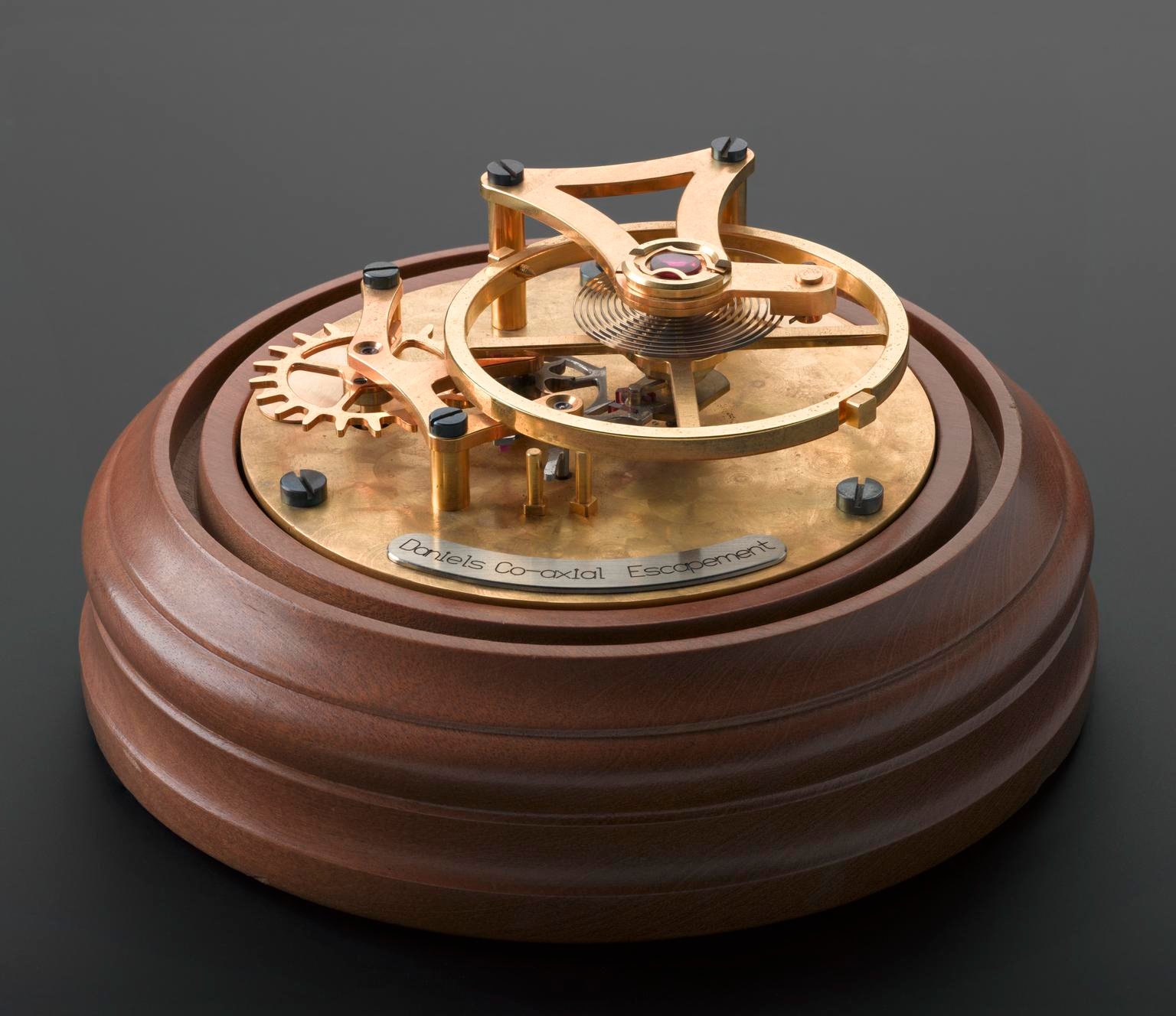 Daniels had always had a deep interest in escapements, and the idea of the Co-Axial escapement is to dramatically reduce sliding friction. In a conventional lever escapement, the pallet stones slide across the teeth of the escape wheel, generating considerable friction and wear over time. Daniels’ Co-Axial design introduces a more sophisticated mechanism with an intermediate wheel and two escape wheels on the same axis — hence, Co-Axial. In this construction, the interaction between the balance wheel’s roller jewel and the lever’s impulse jewel delivers a radial, “pushing” impulse. By separating the locking and impulse actions, the design reduces sliding friction between the pallet stones and the escape wheel’s teeth, enhancing efficiency, accuracy, and longevity.