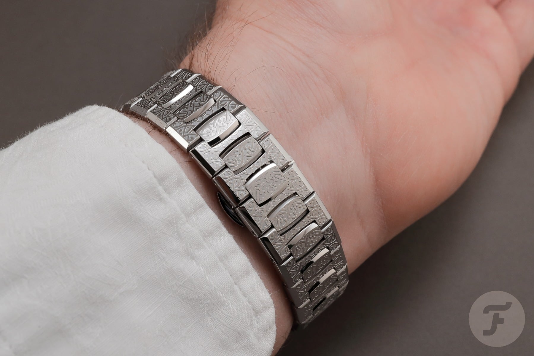 A broad, polished chamfer along the upper case flanks continues along the outer edges of the bracelet to intensify the visual unity of case and bracelet. When I look at the side of the case, I notice that the engraved pattern does not repeat along the sides of the links. The screws fastening the bracelet to the case do not look very attractive, especially up close. But when I wear the watch, those details on the sides don’t strike me. The winding crown visually stands out a bit. Even its color is slightly different. But this only becomes apparent at close inspection.