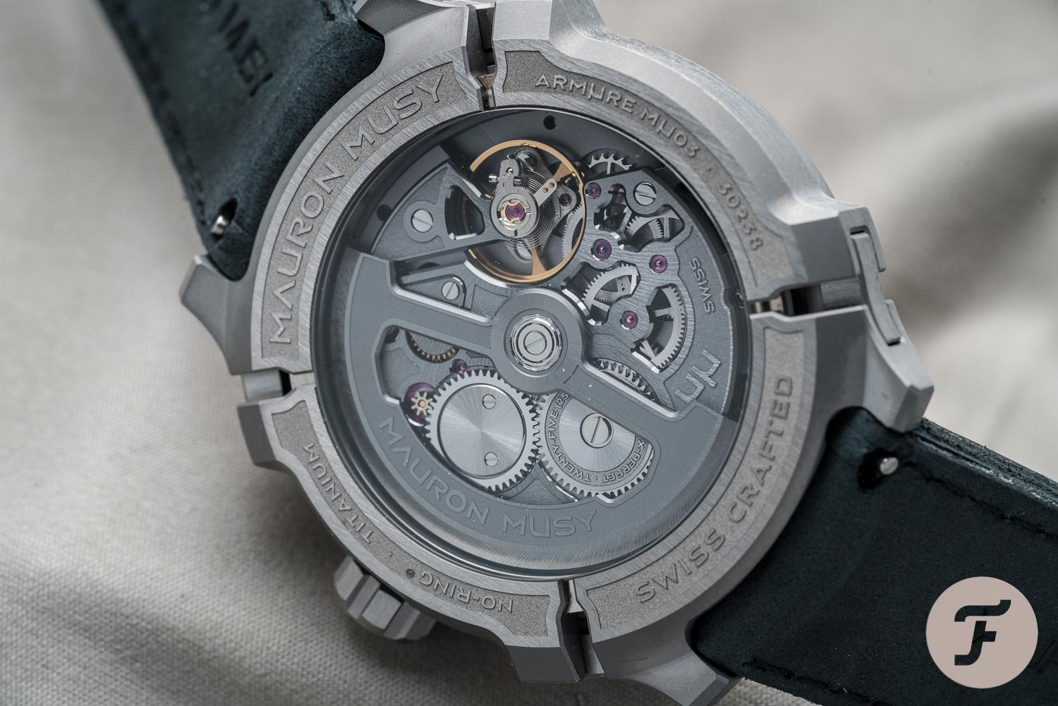 The Mauron Musy Armure MU03 boasts an incredibly complex case construction comprised of 36 components. This model, unlike some earlier models, is made from titanium. One thing it shares with its forerunners, however, is what makes Mauron Musy’s product offering so compelling.