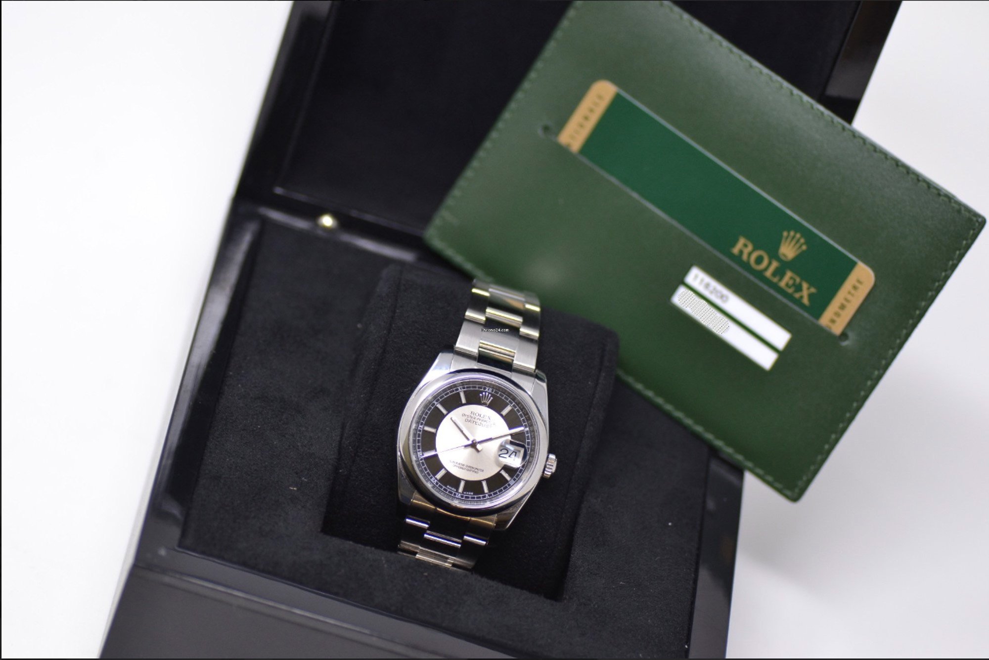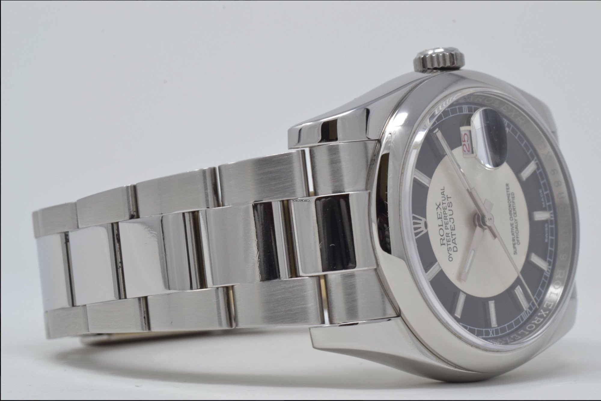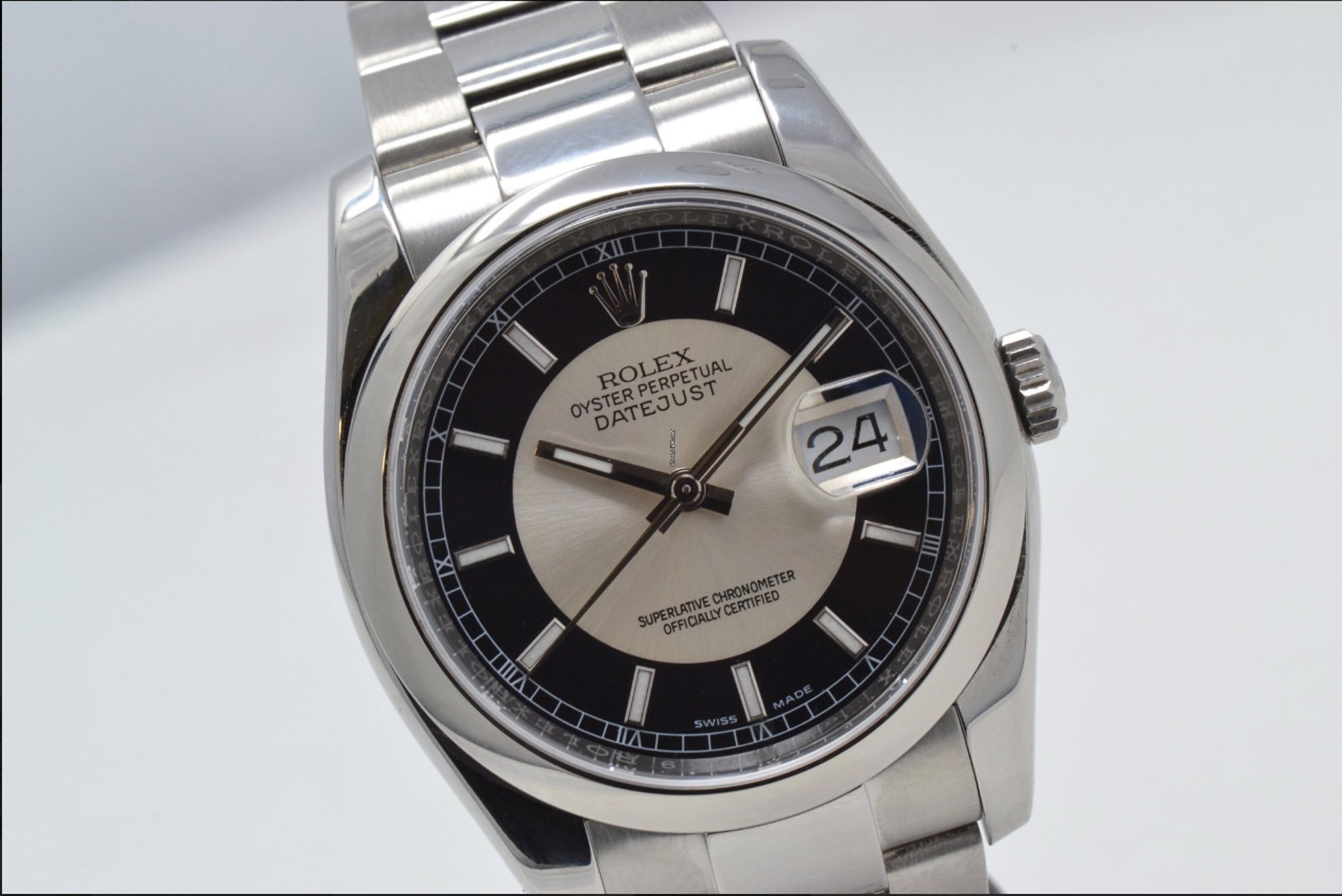 The Rolex Datejust Tuxedo dial is a reference 116200 model in 36mm and it came in what I surmise as a couple dial variants. I’ve seen a version with a silver center and white surrounds along with today’s model that has a silver center and black surround. The watches were available with either a fluted white gold or smooth steel bezel. The bracelet was offered in Oyster or Jubilee and the date wheel was seemingly made with either black font or alternating black/red roulette.