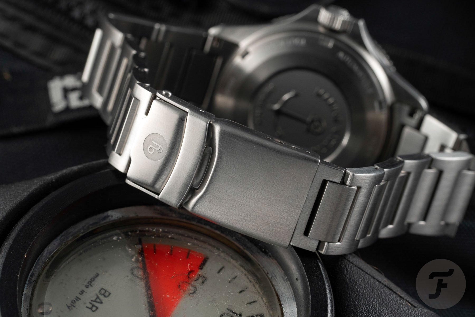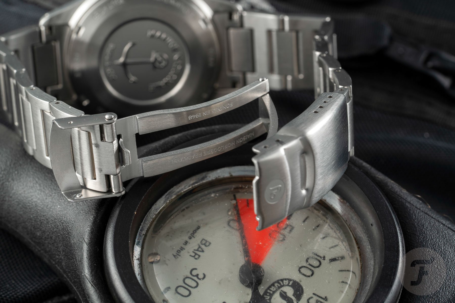 The watch is waterproof to 990 feet (that’s 301.752 meters to be exact). Interestingly, the bidirectional 24 hour-bezel is made from slightly glossy sapphire and not ceramic as you might expect when looking at it. Blancpain uses sapphire in the bezels of its Fifty-Fathoms diving watches, so it’s nothing new, but in the more modest price-category YEMA operates, using this material gives the watch a more exclusive feel.