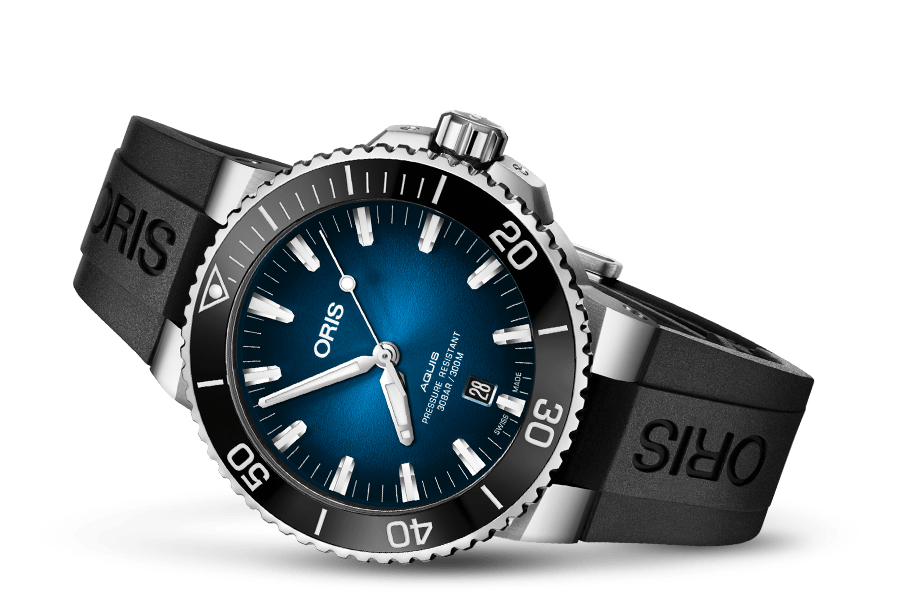 The beautiful gradient blue dial of the Oris Aquis Clipperton was inspired by the water surrounding the atoll. The gradient, from light to dark blue color, is caused by the water depths inside of the atoll, some over 70 meters deep. And this weeks question is about the concern if the gradient blue dial wouldn’t lose its lustre when regularly used in direct sunlight.