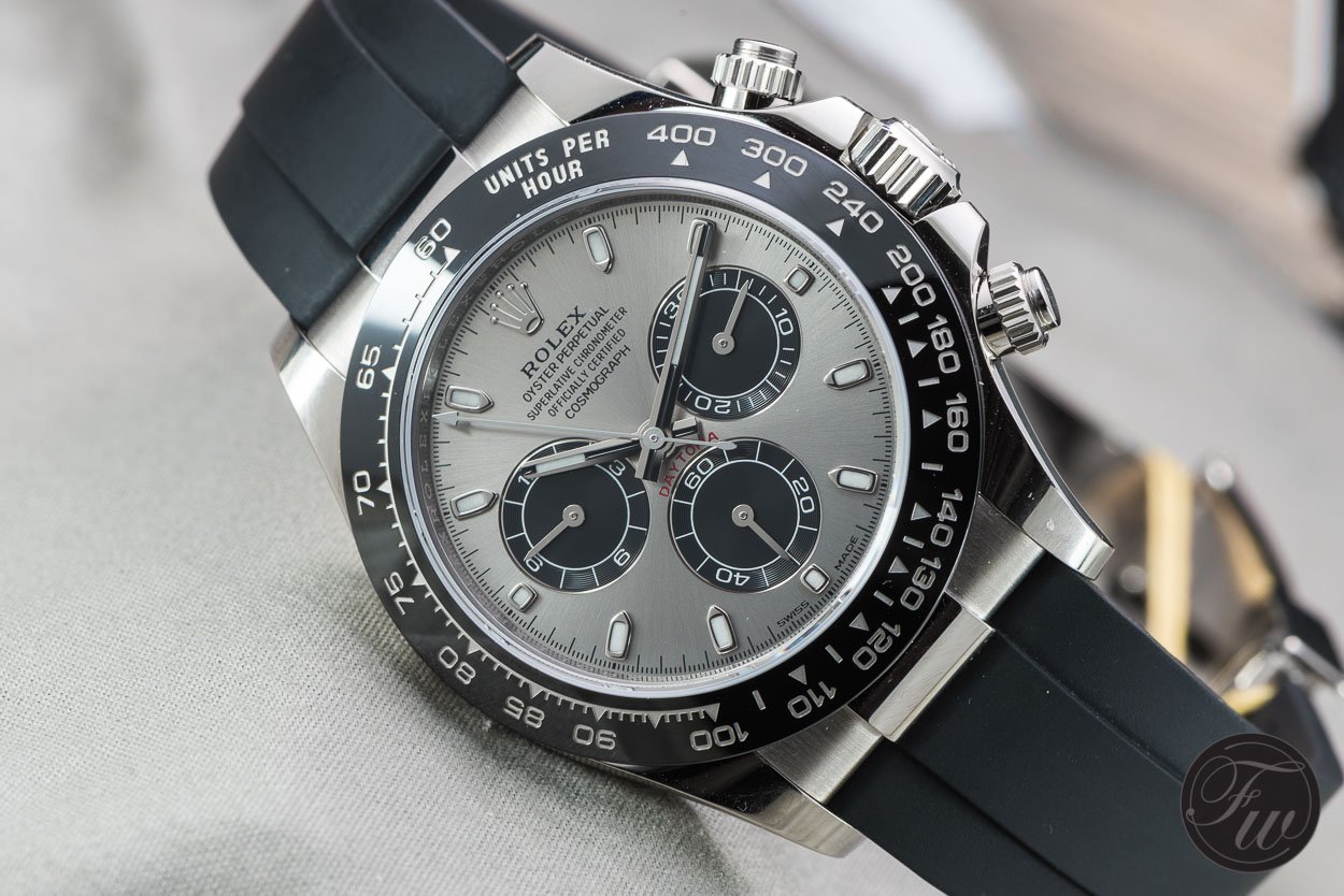 So far, I am considering the steel versions of the Rolex Sky-Dweller and the Audemars Piguet Royal Oak. While the former is actually 100% of what I am looking for in terms of functionalities and the Royal Oak is, of course, a classic, I would prefer something a little smaller in size. Not to mention the wait list for both models which seems to be very long. During the last visit to my preferred watch dealer, he showed me the Daytona in white gold on the rubber strap. While this is actually a bit beyond my allotted budget, I am hooked.