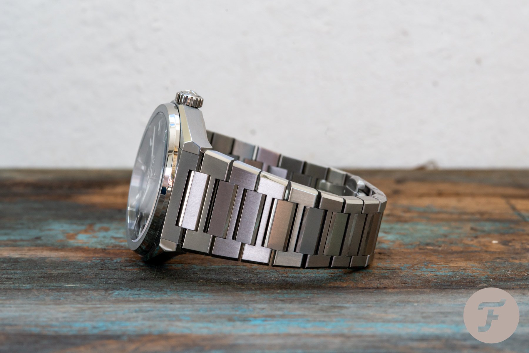 I mentioned the bracelet already, with its beautifully executed facets on its edges and center links. The feel is fantastic as well; titanium wears like a charm. And then the tapering. Coming from a width of 25 mm at the case (lug width is 22 mm), and tapering equally over more than half of the length of the bracelet to not even 18 mm at the folding clasp. That’s an awesome bracelet, matching the best of bracelets known in the industry.
