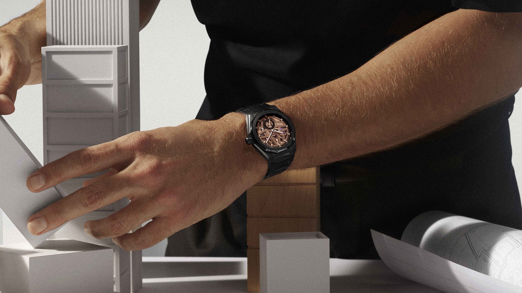 We’re staying on theme with the notably less stealthy black ceramic Zenith Defy Skyline Skeleton with a rose-gold-colored open-worked dial (ref. 49.9300.3620/07.I001). The Defy Skeleton first launched during LVMH Watch Week in 2023 and has seen various forms over the past three years. For this new edition, Zenith has chosen to execute the 41mm × 47mm × 12.5mm case in black ceramic and pair it with a matching bracelet.