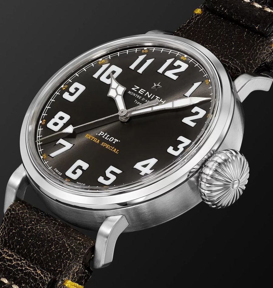 The huge, bulbous crown has beautiful, polished knurling. Not only that, it is delightfully supple in the fingers and an absolute joy to turn. The yellow accents are lively, yet not obnoxious. And with horizontal brushing on the case sides and lugs, accented by a gleaming bezel and crown, the finishing is absolutely to die for. As a Zenith, of course, it features an in-house caliber. The Elite 679 inside came to life in the 1990s, marking the first time Zenith used CAD to design a movement. And though it’s not the highest-spec caliber on the market these days, it still features a 28,800vph frequency and a respectable 50-hour power reserve. Oh, and did I mention, the case of the Zenith Pilot is 100m water-resistant? For an aviation watch, that ain’t too shabby.